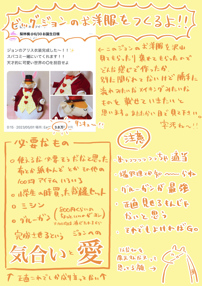apap_cos☆quiet followPAST○ビッグジョンお洋服メイキング(4/9)ビッグジョンのお洋服をつくる流れをまとめましたびっくりするほど適当なので、ゆるく見てください※ヌーフェス〜夏の○まつり展示再掲〜※横顔&口元ですが一部レイヤー本人の顔が写っていますのでご注意下さい #吸死 Kyuushi #ジョン・O・ガーディアン johnO.Guardian #ヒナイチ #ヌーフェス #写真 photo show all(+3 images) Tap to full screen (size:2892x4096).Repost is prohibited Let's send reactions! freqpopularsnackothersPayment processing Replies from the creator Follow creator you care about!☆quiet follow apap_cosDONEそれいけ限界レイヤーレポ2023/8/20 超吸死に一笑 2023夏ありがとうございました!暑さで記憶ぶっ飛んでるので今回短いです最後のはいつもの差し入れにつけてたみっぴきイラストです 4 apap_cosDONEそれいけ限界レイヤーレポ2023/5/4 超吸死に一笑2023ありがとうございました! 6 apap_cosDONEそれいけ限界レイヤーレポ。2023/1/8インテ吸死に一笑11ありがとうございました! 4 apap_cosDONEそれいけ限界レイヤーレポ2022/10/30インテ吸死一笑9ありがとうございました! 5 apap_cosPASTビッグジョンお洋服メイキング続きです(9/9/)最後はBOOTHのお詫びをするジョンです 5 apap_cosPAST○ビッグジョンお洋服メイキング(4/9)ビッグジョンのお洋服をつくる流れをまとめましたびっくりするほど適当なので、ゆるく見てください※ヌーフェス〜夏の○まつり展示再掲〜※横顔&口元ですが一部レイヤー本人の顔が写っていますのでご注意下さい 4 related works th/tomoe@94MEMO【折り方】オリガミマジロのジョン!ネップリしていただいた皆様&本をお求めいただいた皆様、有難うございます!基本の折り方は「紙風船」です。お楽しみいただけますと幸いです🍀なお「オリガミマジロ折れたよ!」のご報告をいただけますと、作者が狂喜乱舞し、自律神経が整い、冷え性が改善し、次の原稿が光の速さで進みます。宜しくお願いいたします。ご報告はこちら→ @th_output 17 大沼京子DONEすっぴんでラフな格好でゴロゴロスマホいじってリラックスしてるマナーくん吸死キャラ、彼ばかり描いてるな私… kagonmasanDOODLE #ロナルド#吸死#アナログ#ポーズトレス黙ってりゃイケメンなのに、非モテムーブかますとこがかわいいwww ゆきなり@🔰幸成DONEくらいところで光る!ロナルドパジャマ!…を着る半田。 2 18732mitsuoDOODLE微エロのドラヒナ michika92313MOURNING #肋骨ブラウス をドラドラちゃんに着せたい欲が高まりすぎて、描いた一枚です。使用規約だと、ブラウスの作者様は支部への公開は許可されてなさそうでしたので、こちらにこっそり供養・・・;(ついったのははるか下流に流れましたwww) umashio_oooDONE投稿テストジョナルド オサハタREHABILIゲームばっかりしててお絵描きしてなかったから全然思ったように描けんくなってて苦笑いですね uqi_coDOODLE独り寝のさみしさを紛らわせる受マナーくん。 2