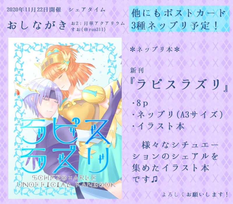 すお🍀☆quiet followINFO11/22開催シェアルオンリーイベントにサークル参加します!ネップリを使った8pイラスト本とポストカード3種の頒布を予定しています!ネップリ番号を含んだおしながきは当日に改めてお知らせさせていただきます!アバタ―もサークルスペースも頑張ったのでぜひお越しください! ##ぷよぷよ Tap to full screen (size:1095x959).Repost is prohibited Let's send reactions! freqpopularsnackothersPayment processing Replies from the creator Follow creator you care about!☆quiet follow すお🍀DONEアルル誕生日おめでとう~!!!!!!!! すお🍀DONEにじそ10で頒布した色紙でした!イベントお疲れさまでした~!新刊と既刊はメロンブックス様に委託、カード系グッズはBOOTHで通販行っておりますのでご入り用の方はどうぞ! すお🍀DONE友人の誕生日に描いたアルルちゃん!!来月誕生日ですね すお🍀DONEマイフェアレディ本からの抜粋です!どうしても配置的に本のノド部分にあたって見えなくなってしまうので、どうせなら背景を別なものにして1つの絵にしてみました~! すお🍀DOODLE類今年も誕生日おめでとう~!!!!!🥳👏🎉 すお🍀PROGRESS類誕進捗ダメすぎる🤤何とかなれ~~~!!! recommended works GYONIKUDOODLE闇の○ープル〇イパロでガ○アイ※注意!首輪&鎖、怪我の描写があります某少女漫画が元ネタです。人間が豹に変身する話。ガ○リオとア○ンが豹に変身できる。変身人間には身体のどこかに豹紋のアザがある。ガ○リオ→会社役員紫豹ア○ン→高3黒豹になれるマッ〇ー→生物学研究者で医師 2 ノウァCAN’T MAKE琥一(ときメモGS)寒すぎる…南国行きたい…筋肉を眺めていたい…(現実逃避)描いてから頭のタオルとアクセ忘れてることに気付いたんで(死)海含めそのうちリベンジ… りとあるDONE麻倉葉くんハオ様おたおめ~!版権の男の子描くの初めてだったからちょっと心配だったけど描き上げられてよかった! ▽▽▽PAST チェラテDOODLE自分を褒め散らかせ褒め上げろ世は残酷だ褒められるのはそうにない!なう(2019/12/27 12:38:34)手反対だあらら 代打の代打DONE薄いファンですが、名探偵コナンより『安室透』様を描かせていただきました 2 PSOTANOSIDONEぷよぷよ×League of Legendsなんか面白そうなSNS見つけたぜ ちゃまめ@えりあすくんLoveDONEエリアスくん mememoriDOODLEマヒト〜〜〜
