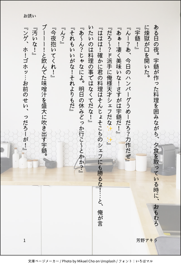 芳野アキラ☆quiet followDONE相互さんと話してて出来た勢いのみのss。ふわっと書いたのでふわっと読んでくださいww💎🔥、現パロ。どーせーしてる感じ。 show all(+4 images) Tap to full screen (size:630x928).Repost is prohibited Let's send reactions! freqpopularsnackothersPayment processing Replies from the creator Follow creator you care about!☆quiet follow 芳野アキラMENUローソンほぼ枠なしでもOKですが、絵によっては枠ありにした方が絵の全体が印刷出来ますこの番号一つで、全イラスト登録してありますセブンイレブンは期限短めです少し端が切れるかもしれませんキャラごとに番号が違います(お手数おかけします💦)パスワードは蜜璃ちゃん誕生日です(数字4つ) 2 芳野アキラDONE🔥🎴で♥️な🛁出来ましたー!🏼色多めなので、ワンくっしょん&フォロ限にしておきます〜 芳野アキラMENUうちれん用の小冊子ネップリです!パスワードは、会場のお品書きに載っています。セブンの方が期限短くて申し訳ないです💦 2 芳野アキラDONE筋💪肉レンシューで描いたのを、色塗りましたー!いちお、肌色⚠️背後⚠️なので、1⃣クッショォン〜 芳野アキラDONEリァ友に頼まれたロ兄の5️⃣条さんと伏◼️くんです!見ようによってはカプっぽいので①クッション〜 芳野アキラReuse Christmas🎄🖼の続きのようなもの♥️あっつーいらっぶーぃ夜を過ごして欲しいな!してるので🔞フォロ限で recommended works 文月ちえり&中の人GIVE UPドラハー小説(の台詞メモ)。Pixiv未公開。3年生。新書版でもいいかもと検証してみた。*ボツ案なのに自サイトには掲載済みという黒歴史を兼任#ハリポタ #ドラハー #二次創作 #短文 #小説 3 かほる(輝海)DONEナルマヨを書くかほるさんには「青空に手を伸ばした」で始まり、「そう小さく呟いた」で終わる物語を書いて欲しいです。できれば7ツイート(980字程度)でお願いします。https://shindanmaker.com/801664逆転裁判(ナルマヨ)でSS。4開始前。コンビでも、恋人でも。大人ルマヨが一番好きだけど、ダルマヨも好き(*´艸`*)ナルマヨ爆発しろ〜!!!💣💣💣 3 twilight_topazMEMO先王に寵愛されていた宦官のその後的な。このあとも色々波乱の人生になりそう。 かほる(輝海)DONEシティーハンター冴羽獠×槇村香原作以上の関係あなたはかほるさんちのRで【はじめてだから / もがくほど深く】をお題にして140字SSを書いてください。#shindanmakerhttps://shindanmaker.com/780366 146 キツキトウDONE2021/6/17書きもの/「entrance」Ⅰ~Ⅳまで。----------------------わーい!小説機能!しかも縦書き対応してる!有難う運営さん!!というわけでテストがてら「entrance」の文章を多少加筆・修正して上げてみる。好い感じだったら少しづつ「Wisteria」の小説も上げてみます。小説投げる場所欲しかったから嬉しいアップデート!やったー! 3530 いりこDONEつづきました やっぱりいちゃいちゃしてるだけ桐島(受)は猫っぽい 須永(攻)は犬っぽい 1933 わ縞 wajimaDONE主ニル生存if想いを確かめ合った夜 4 annko1005aDOODLEちょっと早めだけどサンタちゃん ベイマックス好き@金田ァーーーーDONE描けました。さっきまで描いていたイラストよりも、早く描けました。アニメ塗りぽく出来ました。線画とサイン有りを載せておきます。線画は是非塗ってくれると、嬉しいです。「一番の風」#絵描きさんと繋がりたい #ツイステファンアート #エーストラッポラ #ミニキャラ #デジタルイラスト 3