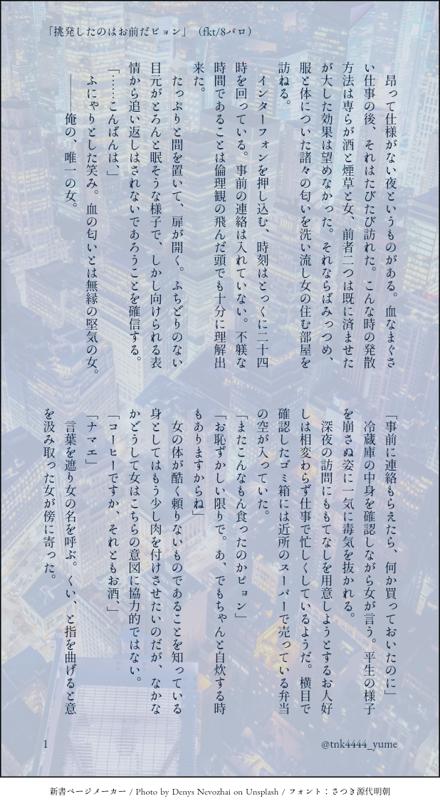 tnk4444_yume☆quiet followDONE懲りずにfkt/8パロちょっと表現があるので一応ワンクッション #SDプラス sdPlus show all(+2 images) Tap to full screen (size:618x1132).Repost is prohibited Let's send reactions! freqpopularsnackothersPayment processing Replies from the creator Follow creator you care about!☆quiet follow tnk4444_yumeDONEkwtの胃袋を掴んで離さなかったり離れなれなかったりする話。⚠年齢操作⚠直接的な描写や用語は避けてますが、行為また事後表現があります。苦手な方はご注意ください。注意事項はお読み頂けましたか?それでも大丈夫な方は「yes」と入力してお入りください。 3 tnk4444_yumeDONESDプラス/fkt大人設定。直接的な表現はないけど事後表現があるためワンクッション。 3 tnk4444_yumeDONESDプラス/fkt商品名やらあれな名詞が出てくるので一応ワンクッション 3 tnk4444_yumeDONE懲りずにfkt/8パロちょっと表現があるので一応ワンクッション 3 tnk4444_yumeDONEつけ込むfktの話。直接的な言葉が入ってるので一応ワンクッション。 3 related works 玖堂らいか@SD再燃中TRAINING++あてんしょん!++三井と顔有夢主の夢イラストです。R18はありませんが、大体いちゃついてます!!(ポーズ素材使用による習作まとめです) 8 momen8_dPASTサイトに置いていたskrgと双子の姉に片想いをするmt夢を手直し。#SD夢#SDプラス 4405 oreno_yume8deDOODLEswktくんの背中の大きさを感じたいってやつ。⚠️顔アリです。#SDプラス 2 tnk4444_yumeDONEつけ込むfktの話。直接的な言葉が入ってるので一応ワンクッション。 3 カニ腹DONE #SD夢 #SDプラスDT ksn の初体験🔞流血表現あります。(鼻血)18歳以上? 11 fogbound0613DOODLE線画でらくがきですが一応肌色なので… oreno_yume8deDONE別のク/ラ/スの子に片/想/い/中のmygくん。名/前なしです。#SD夢 #SDプラス 3220 o_oakatyanPROGRESS8パロrkwとDV気質rkw31日配布本の内容です。30p 300円rkw、mti、mt、sndの8パロ話特典 Ji⚪︎lの香りの鉄.男夢小説 rkwオーロラトレカ 2 ちゃーはんDONE小説も試しにぽいぴくにあげてみた。偏頭痛持ちの夢主ちゃんと、その看病をするみついさんの話。⚠️偏頭痛の描写は私の経験談を基に書いていますが、その症状や服薬方法は人それぞれ違います。⚠️SDプラス、mti夢 3921