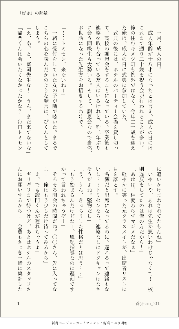 sou_2115☆こそフォロできたオンイベ展示画像版(全14ページ)キメ学だけど幼馴染みじゃない、両片想いの義炭。在学中は何もなかったけど、成人式で再会して盛り上がるのっていいですよね!後半はトミセン視点。みじかくてすみませんが!もう何度も煎じられているネタですみませんが! すべて表示(+13枚) タップで全画面(原寸:618x1132)無断転載禁止 リアクションをたくさん送って応援しよう! よく使う人気おやつその他支払処理中 作者からのリプライ 気になる人をどんどんフォローしよう!☆こそフォロ sou_2115できた2/13オンイベ展示在学中は何もなかった二人だけど、成人式で再会して盛り上がるのっていいですよね!もう何度も煎じられているネタですみませんが!キメ学軸で、幼馴染みじゃない義炭。後半はトミセン視点です。 7939 sou_2115できたオンイベ展示画像版(全14ページ)キメ学だけど幼馴染みじゃない、両片想いの義炭。在学中は何もなかったけど、成人式で再会して盛り上がるのっていいですよね!後半はトミセン視点。みじかくてすみませんが!もう何度も煎じられているネタですみませんが! 14 sou_2115できたつつやぎさんからいただいた、「午前零時の炭焼き小屋」の幕間絵です!書き下ろし部分から描いてくださっているので、本を読んだ後の方が楽しめるかも。 2 sou_2115できたささやかではありますが、感想を送ってくださった方へのお礼SSです。 5587 sou_2115できた本編のおまけです。一年前のハロウィンの三人。まだ付き合っていない義炭です。 おすすめ作品 n3_xy5らくがきR-18 gtaパロkyng※🚺有 もろみできたZZなかよ師弟漫画🌟 牛ハラミできた大青漫画 hokuu_らくがき丹穹🔞女仆日 sirome0_0できた離れるべき場所。 403 mix_skt供養※ドラマCD「ファーストラブ」のネタバレ【一鶴主】1主ちゃんが一鶴の初恋を知る話彼がいくら一途な性格とはいえ20年も同じ人のこと考え続けるって相当ショックだったんだろうし今でも彼女に救いの言葉ひとつかけられなかったことをずっと心の奥底で悔やみ続けているのだろうと私は解釈していますときめき状態になると1主に己の感情を晒す(=彼女と絆を深める)事を怖がるのもいつか失うのが怖いからなのかも 2179 ToraNoid3675自主練片瀬七海SR 【香月ハニー】 Kururumiryi_39作業進捗四季送り ネタバレあり思考の末たどり着いた境地もちょもちょ書いてる進捗マジ馬鹿という感じですが、こいつ、こういう事だったのか…??と気が着いた瞬間だけは気持ちよかったです。私の気づきすなわち彼の気づきですが露呈することはないでしょう。やっぱり1回分からせないとダメかもしれないが、人の欲や悪的な部分って結局変わらないんでしょうか。(そう) 4 taichizk作業進捗バクマリ本作業進捗🔞白濁液描き忘れてるけどイッてます。あとで描き足すpass➤18歳以上?yes/no 2