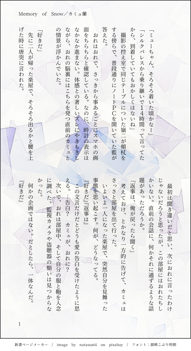 あまぐり☆quiet followDONEMemory of Snow/カミュ蘭全年齢。カミュ蘭は少女漫画だと思ってる弊垢。相変わらずの砂糖 of 砂糖の、らしくねぇふたりの話。 #カミュ蘭 #全年齢 year-roundAge show all(+6 images) Tap to full screen (size:618x1132).Repost is prohibited Let's send reactions! freqpopularsnackothersPayment processing Replies from the creator Follow creator you care about!☆quiet follow あまぐりDONE知らない光/ほんのり翔アラ+アイク男気Rock2開催、おめでとうございます!6月のトゥインクルで無敗にしたSSを限定公開致します。※後日他媒体での再録、公開の可能性あり。 11 あまぐりDONEはじまりのはじまり/ハートフルバイオレンス暴力表現ありです。ご注意ください。どう考えても誕生日プレゼント向きではないですが、これはれっきとしたバースデープレゼントです!!!!おめでとうたぬき!!!!!! 12 あまぐりDONE[R-15]Only the person does not know.題訳:知らぬは本人ばかりなり。シャニライNo moreシリーズより、杜季+杜マル+季マル+カミマル要素有り。たかつきさんの夏の宿題、納めさせて頂きます。 13 あまぐりDONEEver ever after./カミュ蘭全年齢。愛しのふぉろわ、れおさんのバースデー記念に捧げさせて頂きました。作中に存在だけチラつくモブはIf世界のれおさんというプチ設定。現代設定より数年後のふたりです。お誕生日おめでとうございました! 4 あまぐりDONE[R-18]Birthday Present/那嶺Happy Birthday こみさん!!!!!! 6 あまぐりDONESweet morning/カミュ蘭全年齢。タイトルがネタバレ。BGMはYou're my life 以上です。Thanks chiba先生! 3 related works あまぐりDONERevenge Trap…?/レイクラ全年齢。お疲レイジと脳筋クラブくんの擦れ違い小話。 11 あまぐりDONEアイス×音トキ全年齢。以前共通のお題で複数CPチャレンジした際に書いたもの。音トキ真ん中バースデー記念🎉 4 こたつPAST【鳴保】初夜の翌朝/恋人同士/甘め恋人の保のことをナチュラルに大切にする鳴×鳴からの愛情表現を浴びてクソデカ感情がキャパオーバーした保がいる話 6007 あまぐりDONE雨宿り/嶺春全年齢。雨の日がきらいな嶺二さんの話。 8 あまぐりDONESweet morning/カミュ蘭全年齢。タイトルがネタバレ。BGMはYou're my life 以上です。Thanks chiba先生! 3 あまぐりDONEMemory of Snow/カミュ蘭全年齢。カミュ蘭は少女漫画だと思ってる弊垢。相変わらずの砂糖 of 砂糖の、らしくねぇふたりの話。 7 dyan1329MEMOお題ガチヤ帰り道カレーの匂いに食べたくなったぬすまるに、クリーニング店でぬすじがカレーを作って待っていてくれた話 こたつPAST【保鳴】付き合って1年オーバーの保鳴が、休みを合わせて某テーマパークでデートする話犬猿の仲だった頃と変わらないテンションで言葉を交わしているけど、なんだかんだ仲良しな副隊長×隊長がいます。 11108 aorin203_subculDOODLE自作画をアップしていきたい。お絵描きBBS時代のように色を塗れるようになりたい願望。 5
