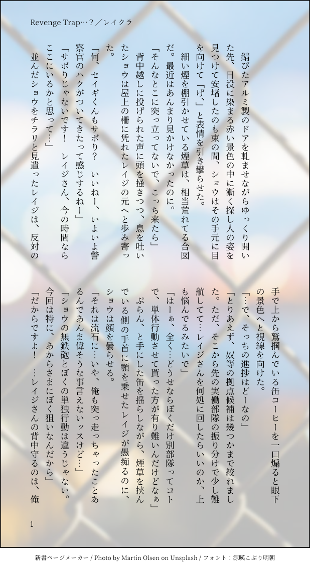 あまぐり☆quiet followDONERevenge Trap…?/レイクラ全年齢。お疲レイジと脳筋クラブくんの擦れ違い小話。 #レイクラ raycra #全年齢 year-roundAge show all(+10 images) Tap to full screen (size:618x1132).Repost is prohibited Let's send reactions! freqpopularsnackothersPayment processing Replies from the creator Follow creator you care about!☆quiet follow あまぐりDONE知らない光/ほんのり翔アラ+アイク男気Rock2開催、おめでとうございます!6月のトゥインクルで無敗にしたSSを限定公開致します。※後日他媒体での再録、公開の可能性あり。 11 あまぐりDONEはじまりのはじまり/ハートフルバイオレンス暴力表現ありです。ご注意ください。どう考えても誕生日プレゼント向きではないですが、これはれっきとしたバースデープレゼントです!!!!おめでとうたぬき!!!!!! 12 あまぐりDONE[R-15]Only the person does not know.題訳:知らぬは本人ばかりなり。シャニライNo moreシリーズより、杜季+杜マル+季マル+カミマル要素有り。たかつきさんの夏の宿題、納めさせて頂きます。 13 あまぐりDONEEver ever after./カミュ蘭全年齢。愛しのふぉろわ、れおさんのバースデー記念に捧げさせて頂きました。作中に存在だけチラつくモブはIf世界のれおさんというプチ設定。現代設定より数年後のふたりです。お誕生日おめでとうございました! 4 あまぐりDONE[R-18]Birthday Present/那嶺Happy Birthday こみさん!!!!!! 6 あまぐりDONESweet morning/カミュ蘭全年齢。タイトルがネタバレ。BGMはYou're my life 以上です。Thanks chiba先生! 3 related works あまぐりDONE【R-15】silent trap!/レイクラエビバデ レイジとJT スパイキークラブあんまり見かけないcpですが、個人的にとても好きな組み合わせです。レイジさんのキスシーンとバトルアクションにチャレンジしたくて書きました。続く予定は今のところない、ですが、ネタが来ればどうかな…。本編に入り切らなかったこぼれ話はこちら。silent trap!こぼれ話 https://privatte 16 みや❄️DOODLERaines and Kurasame, driving each other mad あまぐりDONERevenge Trap…?/レイクラ全年齢。お疲レイジと脳筋クラブくんの擦れ違い小話。 11