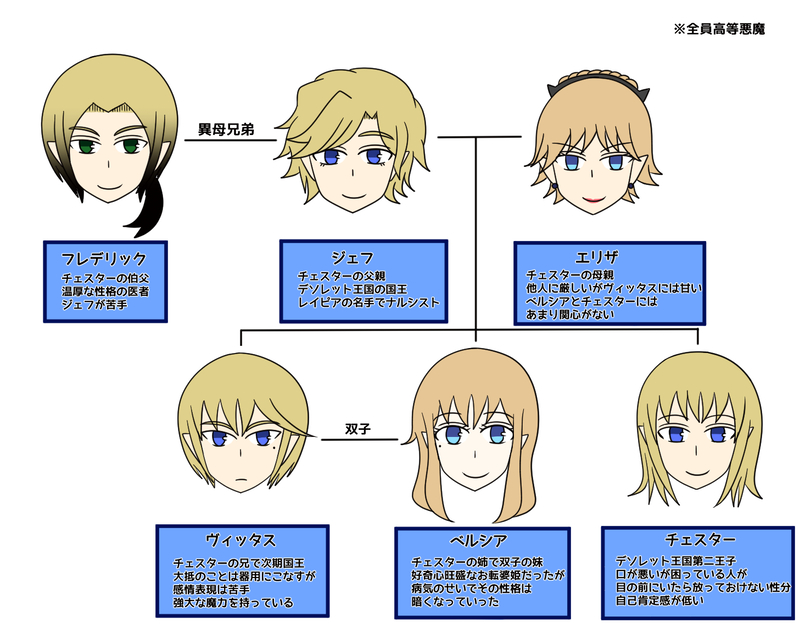 nokikata☆quiet followMEMOチェスターの家族です #チェスター篇 theChesterArc Tap to full screen (size:1457x1144).Repost is prohibited Let's send reactions! freqpopularsnackothersPayment processing Replies from the creator Follow creator you care about!☆quiet follow nokikataSPOILER【ゴーネフ篇ネタバレ注意】正体 nokikataDONEベルシアの死後から約30年。ヴィッタスとチェスターは仲直りをしましたが心に壁が出来たままでした。 nokikataDONE兄弟喧嘩の話を聞いてベルシアはヴィッタスが孤独になっているのではないかと思いました。「ヴィスを独りにしないであげて」チェスターにそう伝えてベルシアはこの世を去りました。 nokikataDONEベルシアとの接し方が分からなくなったヴィッタスにとってチェスターは唯一腹を割って話せる相手でした。ある日両親の前でチェスターとヴィッタスが剣の手合わせをすることになり、チェスターは兄の顔を立てる為にわざと手を抜きました。ヴィッタスは手を抜かれた事に激怒し思い切りチェスターを殴ります。それから2人は口を聞かなくなってしまいました。 nokikataDONEお互い距離を取るようになってしまうヴィッタスとベルシア nokikataDOODLEベッド上で生活することが多くなったベルシア。元気に外を出歩いているヴィッタスを見て嫉妬するようになりました。 related works nokikataDONEお互い距離を取るようになってしまうヴィッタスとベルシア nokikataDONEベルシアの死後から約30年。ヴィッタスとチェスターは仲直りをしましたが心に壁が出来たままでした。 nokikataDOODLE剣の国として有名な魔界のデソレット王国。デソレットの王家には3人の子どもがいました。双子のヴィッタスとベルシア、その弟のチェスターです。双子は強大な魔力を持ち、チェスターは剣の才がありました。 nokikataMEMOチェスターの家族です nokikataDOODLEヴィッタスは自分の魔力でベルシアを元気にできないか魔法や魔法薬の研究を重ねていました。 nokikataDOODLEベッド上で生活することが多くなったベルシア。元気に外を出歩いているヴィッタスを見て嫉妬するようになりました。 nokikataDONEベルシアとの接し方が分からなくなったヴィッタスにとってチェスターは唯一腹を割って話せる相手でした。ある日両親の前でチェスターとヴィッタスが剣の手合わせをすることになり、チェスターは兄の顔を立てる為にわざと手を抜きました。ヴィッタスは手を抜かれた事に激怒し思い切りチェスターを殴ります。それから2人は口を聞かなくなってしまいました。 nokikataDONE兄弟喧嘩の話を聞いてベルシアはヴィッタスが孤独になっているのではないかと思いました。「ヴィスを独りにしないであげて」チェスターにそう伝えてベルシアはこの世を去りました。 nokikataDOODLE小さい頃はその強大な魔力をコントロールできていた双子でしたが成長するにつれて力も大きくなり、ベルシアはその力に体を蝕まれるようになりました。 recommended works nokikataDOODLE剣の国として有名な魔界のデソレット王国。デソレットの王家には3人の子どもがいました。双子のヴィッタスとベルシア、その弟のチェスターです。双子は強大な魔力を持ち、チェスターは剣の才がありました。 nokikataDOODLE小さい頃はその強大な魔力をコントロールできていた双子でしたが成長するにつれて力も大きくなり、ベルシアはその力に体を蝕まれるようになりました。 nokikataMEMOチェスターの家族です nokikataDOODLEヴィッタスは自分の魔力でベルシアを元気にできないか魔法や魔法薬の研究を重ねていました。 nokikataDOODLEベッド上で生活することが多くなったベルシア。元気に外を出歩いているヴィッタスを見て嫉妬するようになりました。 nokikataDONEお互い距離を取るようになってしまうヴィッタスとベルシア nokikataDONEベルシアとの接し方が分からなくなったヴィッタスにとってチェスターは唯一腹を割って話せる相手でした。ある日両親の前でチェスターとヴィッタスが剣の手合わせをすることになり、チェスターは兄の顔を立てる為にわざと手を抜きました。ヴィッタスは手を抜かれた事に激怒し思い切りチェスターを殴ります。それから2人は口を聞かなくなってしまいました。 nokikataDONE兄弟喧嘩の話を聞いてベルシアはヴィッタスが孤独になっているのではないかと思いました。「ヴィスを独りにしないであげて」チェスターにそう伝えてベルシアはこの世を去りました。 nokikataDONEベルシアの死後から約30年。ヴィッタスとチェスターは仲直りをしましたが心に壁が出来たままでした。