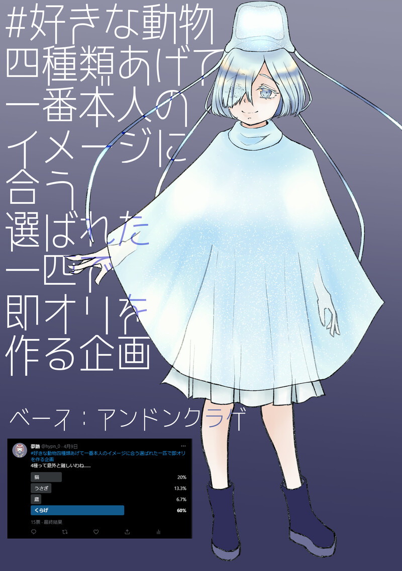 夢路(ゆめじ)☆quiet followDONE #好きな動物四種類あげて一番本人のイメージに合う選ばれた一匹で即オリを作る企画アンドンクラゲちゃん! Tap to full screen (size:2039x2894).Repost is prohibited Let's send reactions! freqpopularsnackothersPayment processing Replies from the creator Follow creator you care about!☆quiet follow 夢路(ゆめじ)DOODLE絵が描けねえ 夢路(ゆめじ)DOODLEあたらしい ぺんを ためした 夢路(ゆめじ)DOODLE多分胸囲250くらいある自機バニー描いたけど飽きた 夢路(ゆめじ)DONEあけおめ2025! 夢路(ゆめじ)DOODLE絵の描き方忘れちまったわ 夢路(ゆめじ)DOODLE黄金AF自機 related works 夢路(ゆめじ)DONE #好きな動物四種類あげて一番本人のイメージに合う選ばれた一匹で即オリを作る企画アンドンクラゲちゃん! recommended works UGATSUDOODLE #創作 ametukiPAST2016年#創作 #水彩 #透明水彩 3 いといとDOODLE昨日だっけか、赤ずきんパロで遊んでました。ハヤトオオカミにアッ―的に食われそうになっているところに出くわした赤ずきんアルマちゃんの対応と、イアリおばあちゃんと、融通が利かなさそうな猟師のルイ君です。 3 kyoDOODLEロボ研登場人物 KARRION_CROWDOODLEオリキャラの小鴉ちゃんこう言うのを上げていけたらいきね ぴぇるそんDOODLE 4 frankenjiDONEアフロ少年と動物シリーズ 3 こさかさん/吉尾高橋MOURNING大昔に描いた漫画をリメイクしようとしてクソ飽きたやつ 7 行けたら行くわDONEポインセチア2020,1,15 4