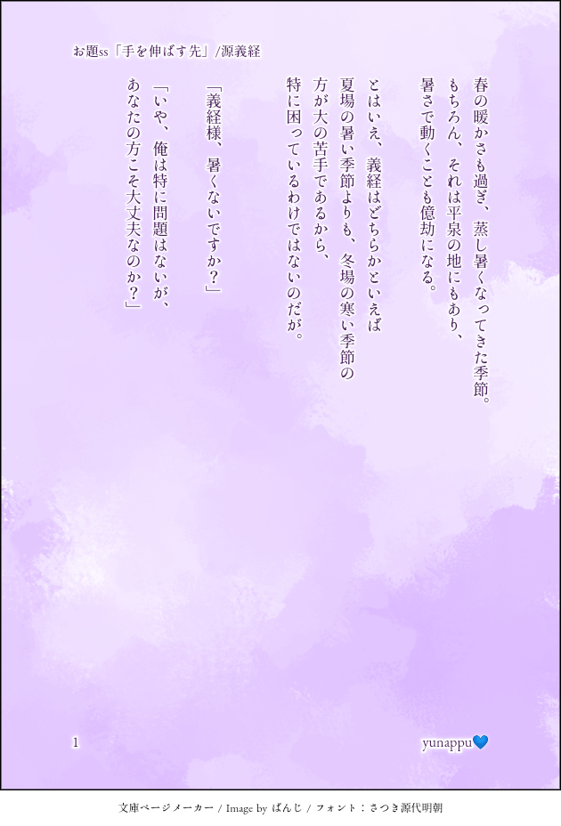 yunappu💙☆quiet followPAST2020年6月20日にTwitterにて投稿したものです。お題『手を伸ばす先』に沿って書いた義経様ssです。 #イケメン源氏伝 #源義経 genyiKeizai show all(+3 images) Tap to full screen (size:630x928).Repost is prohibited Let's send reactions! freqpopularsnackothersPayment processing Replies from the creator Follow creator you care about!☆quiet follow yunappu💙PAST2021年8月16日にTwitterに投稿した信長様ssです。⟡.· ⎯⎯⎯⎯⎯⎯⎯⎯⎯⎯⎯⎯ ⟡.·猛暑の続く日々に熱中症で倒れてしまった舞ちゃんを看病する信長様のお話。⟡.· ⎯⎯⎯⎯⎯⎯⎯⎯⎯⎯⎯⎯ ⟡.· 11 yunappu💙PAST2021年7月20日にTwitterに投稿した光秀さんssです。フォロワーさんの呟きを元に書いた作品になります。⟡.· ⎯⎯⎯⎯⎯⎯⎯⎯⎯⎯⎯⎯ ⟡.·最愛の舞ちゃんに否定される悪夢を見る光秀さんのお話。⟡.· ⎯⎯⎯⎯⎯⎯⎯⎯⎯⎯⎯⎯ ⟡.· 12 yunappu💙PAST2021年6月22日にTwitterに投稿した秀吉さんssです。イケメン戦国リリース6周年記念に書いた作品になります。⟡.· ⎯⎯⎯⎯⎯⎯⎯⎯⎯⎯⎯⎯ ⟡.·『織田家の姫』として宴に出席して頑張った舞ちゃんを甘やかす秀吉さんのお話。⟡.· ⎯⎯⎯⎯⎯⎯⎯⎯⎯⎯⎯⎯ ⟡.· 8 yunappu💙PAST2021年5月23日にTwitterに投稿した帰蝶さんssです。本編配信前に書いた作品になります。安土城下で偶然(?)出会った帰蝶さんに無意識に恋心を抱く舞ちゃんのお話。 4 yunappu💙PAST2021年5月23日にTwitterに投稿した家康ssです。普段舞ちゃんから贈り物をプレゼントしてくれるのでお返しをする家康のお話。 7 yunappu💙PAST2021年5月16日にTwitterに投稿した泰親さんssです。こちらは泰親さん本編配信前に書いた作品になります。由乃ちゃんへの恋心を自覚した泰親さんのお話。 4 related works あさくらさくらDOODLE公式Twitterキャンペーンネタ公式さんがやってくれるみたいなので供養😂泥団子投げる頼朝様も見たい気がする あさくらさくらDONEイケメン源氏伝泰親さん、伊吹、由乃さん。狩衣の袖括り描きたかったけど難しすぎた…線画〜着彩までArtset。graphite pencil+watercolor fine が好きみたい。最後にアイビスで色調補正。 5 あさくらさくらMAIKING由乃さん可愛く描けた気がする(まだ途中)Artset4、watercolor fineでじわーっと滲ませながら塗るのが楽しくなってきた! あさくらさくらDOODLEArtset4練習。今日はoil pastelで朝廷組。 あさくらさくらDONE泰親さん本編配信おめでとうございます!あのPVがもうたまんなくて…!この世で一番優しい技と、哀しい笑顔の陰陽師。アイビスペイントで作成(由乃さんの涙を描いたら悲しすぎたのでやめた) 6 あさくらさくらHappy New YearTwitterワンドロ企画「イケシリ版深夜の真剣お絵描き文字書き60分一本勝負」ログです。2020年02月〜2022年01月分。ほぼ源氏伝、たまーにヴァン、新大奥、王子。後日手を加えたもの、追加妄想落書きも一緒に。 54 あさくらさくらPROGRESS描込み前だけどこれはこれでと思った☺️泰親さん描くのやっぱ好きだ〜 あさくらさくらDOODLE水も滴る景時さん。「濡れました。手ぬぐいと着替えを」濡れてぺたんこになる髪をみたい。 2 あさくらさくらDONEハッピー節分デイ!泰親さん、ちゃんと陰陽師してる姿好きです。豆まきでもえげつない祓いの効果を発揮しそう…あと弁慶が脱いでる理由は気合のためです(たぶん) 4