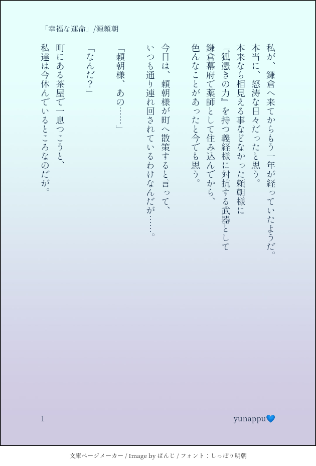 yunappu💙☆quiet followPAST2020年8月20日にTwitterに投稿した頼朝様ssです。こちらは源氏伝1周年記念タグ#全縁がここに繋がる源氏伝1周年記念にて投稿させていただいたお話になります。今日という記念日のために公務を終わらせた頼朝様が由乃ちゃんと茶屋でゆったりするお話。 #イケメン源氏伝 #源頼朝 minamotoNoYoritomo show all(+6 images) Tap to full screen (size:630x928).Repost is prohibited Let's send reactions! freqpopularsnackothersPayment processing Replies from the creator Follow creator you care about!☆quiet follow yunappu💙PAST2021年8月16日にTwitterに投稿した信長様ssです。⟡.· ⎯⎯⎯⎯⎯⎯⎯⎯⎯⎯⎯⎯ ⟡.·猛暑の続く日々に熱中症で倒れてしまった舞ちゃんを看病する信長様のお話。⟡.· ⎯⎯⎯⎯⎯⎯⎯⎯⎯⎯⎯⎯ ⟡.· 11 yunappu💙PAST2021年7月20日にTwitterに投稿した光秀さんssです。フォロワーさんの呟きを元に書いた作品になります。⟡.· ⎯⎯⎯⎯⎯⎯⎯⎯⎯⎯⎯⎯ ⟡.·最愛の舞ちゃんに否定される悪夢を見る光秀さんのお話。⟡.· ⎯⎯⎯⎯⎯⎯⎯⎯⎯⎯⎯⎯ ⟡.· 12 yunappu💙PAST2021年6月22日にTwitterに投稿した秀吉さんssです。イケメン戦国リリース6周年記念に書いた作品になります。⟡.· ⎯⎯⎯⎯⎯⎯⎯⎯⎯⎯⎯⎯ ⟡.·『織田家の姫』として宴に出席して頑張った舞ちゃんを甘やかす秀吉さんのお話。⟡.· ⎯⎯⎯⎯⎯⎯⎯⎯⎯⎯⎯⎯ ⟡.· 8 yunappu💙PAST2021年5月23日にTwitterに投稿した帰蝶さんssです。本編配信前に書いた作品になります。安土城下で偶然(?)出会った帰蝶さんに無意識に恋心を抱く舞ちゃんのお話。 4 yunappu💙PAST2021年5月23日にTwitterに投稿した家康ssです。普段舞ちゃんから贈り物をプレゼントしてくれるのでお返しをする家康のお話。 7 yunappu💙PAST2021年5月16日にTwitterに投稿した泰親さんssです。こちらは泰親さん本編配信前に書いた作品になります。由乃ちゃんへの恋心を自覚した泰親さんのお話。 4 related works yunappu💙PAST2020年8月20日にTwitterに投稿した義経様ssです。こちらは #全縁がここに繋がる源氏伝1周年記念 にて前回の頼朝様同様、源氏伝1周年記念に書いたお話になります。由乃が平泉に来て一年の記念日に義経様と逢瀬をするお話。 11 yunappu💙PAST2020年8月20日にTwitterに投稿した頼朝様ssです。こちらは源氏伝1周年記念タグ#全縁がここに繋がる源氏伝1周年記念にて投稿させていただいたお話になります。今日という記念日のために公務を終わらせた頼朝様が由乃ちゃんと茶屋でゆったりするお話。 7 recommended works ベツィSPOILER関ヶ原の感動の再会良かったなぁ すごく嬉しそうな三成が本当によかった まあその直後に撥ね飛ばされるんだけどね そういえば山崎の戦いによるとねこはサルに轢かれると死ぬらしいので、あの時に三成死んだのでは??そこまでは確認してなかったなぁ…… nicansfwDOODLEa crossover 4 nicansfwDOODLEYoshitsune minamoto Ushiwakamaru VS Musashibou Benkei Nipponia_kokeziDONE義経さん kurou_mhDONE【イケ戦】フォロワーさんのお誕生日用に描いた政宗。何頑張ったって、家紋だよ!死ぬかと思ったよ、伊達家の家紋! Nipponia_kokeziDOODLEうたたねしてたらでてきた学ラン義経さん(幻視 あさくらさくらDOODLEArtset4練習中。線画Dryden+着色feltmarker。続きはあした。 2 あさくらさくらDONEArtset4で描いたあとアイビスで補正。線画graphite pencil 、着彩watercolor fineを中心に色々。イケメン源氏伝の泰親さん&由乃さん。 あさくらさくらMAIKING由乃さん可愛く描けた気がする(まだ途中)Artset4、watercolor fineでじわーっと滲ませながら塗るのが楽しくなってきた!