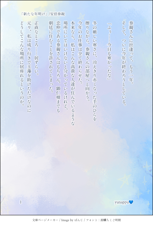 yunappu💙☆quiet followPAST2020年12月31日にTwitterに投稿した泰観さんssになります。「新たな年明け」/安倍泰親新しい年明けを迎える由乃ちゃんと泰観さんのお話。 #イケメン源氏伝 #安倍泰親 abeTaijin show all(+10 images) Tap to full screen (size:630x928).Repost is prohibited Let's send reactions! freqpopularsnackothersPayment processing Replies from the creator Follow creator you care about!☆quiet follow yunappu💙PAST2021年8月16日にTwitterに投稿した信長様ssです。⟡.· ⎯⎯⎯⎯⎯⎯⎯⎯⎯⎯⎯⎯ ⟡.·猛暑の続く日々に熱中症で倒れてしまった舞ちゃんを看病する信長様のお話。⟡.· ⎯⎯⎯⎯⎯⎯⎯⎯⎯⎯⎯⎯ ⟡.· 11 yunappu💙PAST2021年7月20日にTwitterに投稿した光秀さんssです。フォロワーさんの呟きを元に書いた作品になります。⟡.· ⎯⎯⎯⎯⎯⎯⎯⎯⎯⎯⎯⎯ ⟡.·最愛の舞ちゃんに否定される悪夢を見る光秀さんのお話。⟡.· ⎯⎯⎯⎯⎯⎯⎯⎯⎯⎯⎯⎯ ⟡.· 12 yunappu💙PAST2021年6月22日にTwitterに投稿した秀吉さんssです。イケメン戦国リリース6周年記念に書いた作品になります。⟡.· ⎯⎯⎯⎯⎯⎯⎯⎯⎯⎯⎯⎯ ⟡.·『織田家の姫』として宴に出席して頑張った舞ちゃんを甘やかす秀吉さんのお話。⟡.· ⎯⎯⎯⎯⎯⎯⎯⎯⎯⎯⎯⎯ ⟡.· 8 yunappu💙PAST2021年5月23日にTwitterに投稿した帰蝶さんssです。本編配信前に書いた作品になります。安土城下で偶然(?)出会った帰蝶さんに無意識に恋心を抱く舞ちゃんのお話。 4 yunappu💙PAST2021年5月23日にTwitterに投稿した家康ssです。普段舞ちゃんから贈り物をプレゼントしてくれるのでお返しをする家康のお話。 7 yunappu💙PAST2021年5月16日にTwitterに投稿した泰親さんssです。こちらは泰親さん本編配信前に書いた作品になります。由乃ちゃんへの恋心を自覚した泰親さんのお話。 4 related works yunappu💙PAST2020年12月31日にTwitterに投稿した泰親さんssです。「新たな年明け」/安倍泰親 のおまけ話です。 10 yunappu💙PAST2022年1月7日にぷらいべったーにて公開した泰親さんssです。⚠泰親さん本編ネタバレを含みます⚠↑特に23話あたりの内容に触れています。 2841 yunappu💙PAST2021年3月15日にTwitterに投稿した泰親さんBD小説になります。#天才陰陽師安倍泰親誕生祭2021↑こちらのタグを付けて投稿させて頂いていました。泰親さんの誕生日当日になっても、喜んでくれるような贈り物が思い浮かばず、悩んでいるところに顕仁様から助言を受けて栞を贈ることに決めた由乃と、贈り物を貰った泰親との甘々なお話。 14 yunappu💙PAST2020年12月31日にTwitterに投稿した泰観さんssになります。「新たな年明け」/安倍泰親新しい年明けを迎える由乃ちゃんと泰観さんのお話。 11 yunappu💙PAST2020年3月15日の泰親さんBD企画にて投稿した作品です。当時はまだ私の中で謎のベールに包まれていたキャラだったので短い短編になっています😅💦(もちろん今でも大して変わっていませんが)⇩Twitterタグ#天才陰陽師安倍泰親誕生祭2020 2 yunappu💙PAST2021年5月16日にTwitterに投稿した泰親さんssです。こちらは泰親さん本編配信前に書いた作品になります。由乃ちゃんへの恋心を自覚した泰親さんのお話。 4