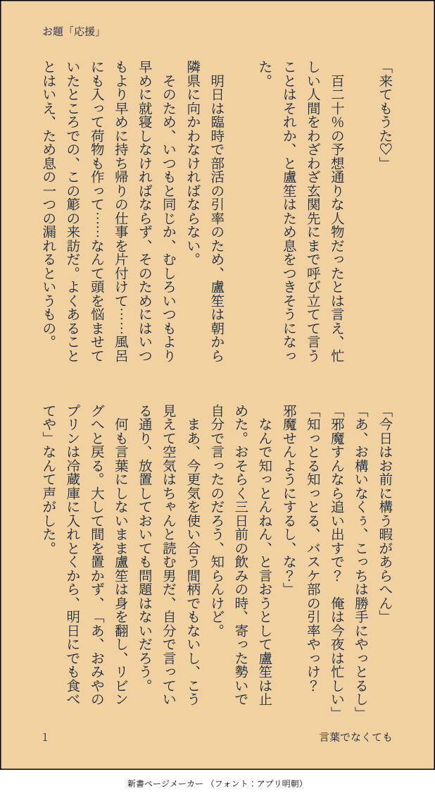 つなみ☆quiet followDONE #ささろワンドロライ 7月27日お題「応援」無自覚同士のささろ。くっついてません。くっついてないのに物理的距離がやたらと近い2人の話。 show all(+7 images) Tap to full screen (size:618x1132).Repost is prohibited Let's send reactions! freqpopularsnackothersPayment processing Replies from the creator Follow creator you care about!☆quiet follow つなみDONE #ささろワンドロライ2025/09/13課題「力」今回初めて「コマの上にキャラを描く」やり方を知りました…これやってみたかったんだよなあ つなみDONE #ささろワンドロライ2025/09/06課題「暇」 つなみDONE #ささろワンドロライ2025/08/30課題「間に合う」 つなみDONE #ささろワンドロライ2025/08/23課題「怪談」※8/27追記零のひげを描き忘れてて描き足しました…なんでそんなとこ描き忘れた!?今更気づいた自分にショック…… つなみDONE #ささろワンドロライ2025/08/16課題「合鍵」のボツver.です。せっかくなのでここで供養…。仕上げてみないと分からないのホント不思議。 つなみDONE #ささろワンドロライ2025/08/16課題「合鍵」 related works つなみDONE #ささろワンドロライ 10月21日お題「おねだり」できてないささろです。ついつい簓のわがままをきいてやってしまう盧笙の話。 8 chatakeDOODLEお題「知りたい」+1.5hささらのカレーメシ動画がちょうどアップされた日だったので無理矢理絡めました 2 つなみDONE #ささろワンドロライ 11月4日お題+15分「はえる」(映える)(4/全8頁)できてるけれど次の関係に進むのにためらっている2人の話。・途中上とか下とかの話をしますが、最初から最後までささろです。・冒頭と最後にモブが出ます。 8 つなみDONE #ささろワンドロライ7月29日お題「携帯」aba直後くらい、まだ若干ぎくしゃくしているささ→ろ。簓は意識済の片想い状態です。暑い中、盧笙の部屋でダラダラしている2人の話。作中のアレの話。どうでもいいけど、一応検索してみて地域特有の言い方ではなかったぽいので、こんな感じにしてみましたが、やっぱろしょーにはちゅーちゅー言って欲しい……可愛いので……。 7 chatakeDONEお題「おやすみ」 ああやDONE #ささろワンドロライ第115回「こたえる(漢字変換自由)」相互理解って難しいけどそれでもいいと思うお話。シリアスではないですがちょい暗。 3125 つなみDONE #ささろワンドロライ 5月4日お題「初夏」できたてのささろ。翌朝色々思い出して1人でもだもだしている盧笙の話。簓はあまり出てきません。あとほんの少しだけ零もいます。 8 つなみDONE #ささろワンドロライ 1月6日お題「あかり」両片思いのささろ。間違いなく両想いですが、若干すれ違い気味です。恋心を自覚した🧑🏫が思い悩む話。通りすがりのモブと0️⃣が少しだけしゃべります。 9 ああやDONE #ささろワンドロライ 第120回「爆発」 (+0.5h)アホギャグ。れー視点 1909