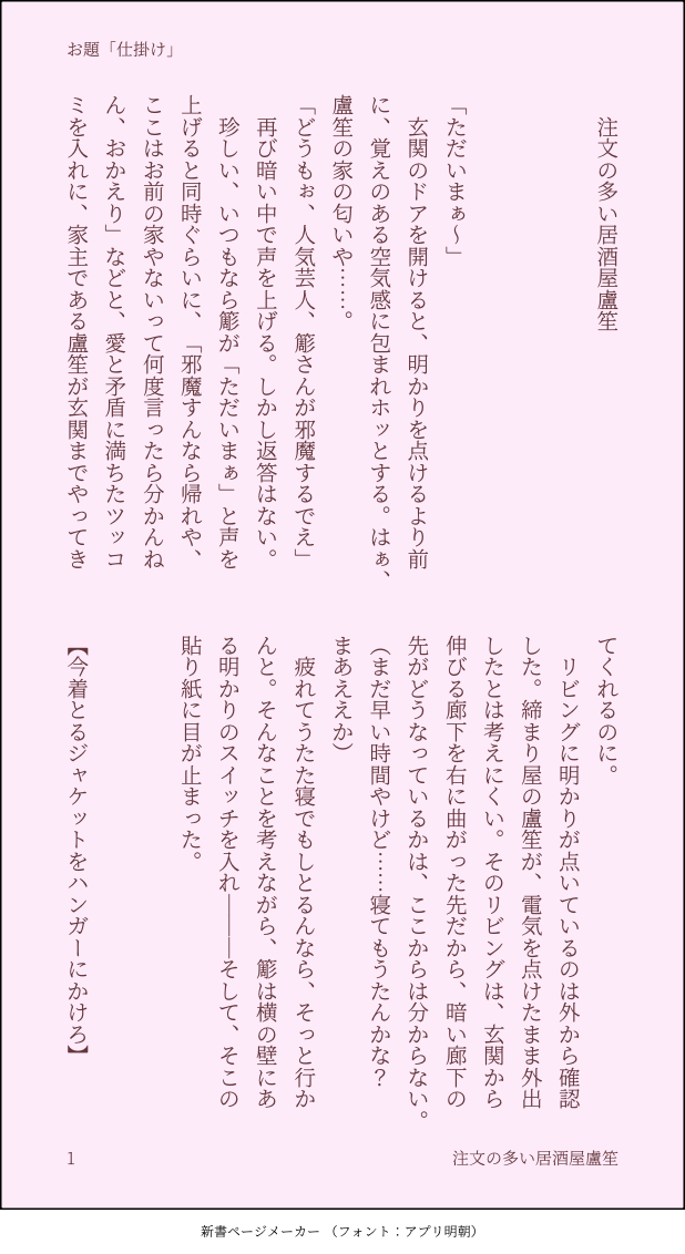 つなみ☆quiet followDONE #ささろワンドロライ 9月21日お題「仕掛け」できてるささろ。お互いを信頼しきってるささろの、何でもないとある夜の話。会話中に下ネタ含みます。 #ささろワンドロライ #ささろ sasaro #簓盧 show all(+7 images) Tap to full screen (size:618x1132).Repost is prohibited Let's send reactions! freqpopularsnackothersPayment processing Replies from the creator Follow creator you care about!☆quiet follow つなみDONE #ささろワンドロライ2025/09/13課題「力」今回初めて「コマの上にキャラを描く」やり方を知りました…これやってみたかったんだよなあ つなみDONE #ささろワンドロライ2025/09/06課題「暇」 つなみDONE #ささろワンドロライ2025/08/30課題「間に合う」 つなみDONE #ささろワンドロライ2025/08/23課題「怪談」※8/27追記零のひげを描き忘れてて描き足しました…なんでそんなとこ描き忘れた!?今更気づいた自分にショック…… つなみDONE #ささろワンドロライ2025/08/16課題「合鍵」のボツver.です。せっかくなのでここで供養…。仕上げてみないと分からないのホント不思議。 つなみDONE #ささろワンドロライ2025/08/16課題「合鍵」 related works つなみDONE #ささろワンドロライ 5月4日お題「初夏」できたてのささろ。翌朝色々思い出して1人でもだもだしている盧笙の話。簓はあまり出てきません。あとほんの少しだけ零もいます。 8 つなみDONE #ささろワンドロライ7月29日お題「携帯」aba直後くらい、まだ若干ぎくしゃくしているささ→ろ。簓は意識済の片想い状態です。暑い中、盧笙の部屋でダラダラしている2人の話。作中のアレの話。どうでもいいけど、一応検索してみて地域特有の言い方ではなかったぽいので、こんな感じにしてみましたが、やっぱろしょーにはちゅーちゅー言って欲しい……可愛いので……。 7 ああやDONE #ささろワンドロライ第115回「こたえる(漢字変換自由)」相互理解って難しいけどそれでもいいと思うお話。シリアスではないですがちょい暗。ふしぎノクターン簓は時々不思議なことを言う。 その度盧笙はどう答えて良いのか迷い、とりあえずぱっと浮かんだ言葉を返す。スピード感ある会話はオオサカ人のウリやから。いや知らんけど。 そして簓が吐いた言葉は盧笙の頭の中どこかを縛り付けて、『あん時何てコメントすればよかったんやろうなぁ』と盧笙は悩むことになる。 『コンビ組んでた頃はこんなこと無かってん。いつからやろ、あんなん言い出し始めたんは。』と更に悩みは深くなり泥沼化。 一方、簓はその不思議な言葉を言う時も言った後も『え、俺なんか言うた?なんも変な事言うてへんよ、今日も無敵でパワフルなぬるさらちゃんですよ』という態度を取るので、あれかなもうええんかな、と盧笙が忘れたふりをしていると、またそのうち不意打ち、不思議な事を吐くのでまた盧笙はぽけーっとなってしまう。 3125 つなみDONE #ささろワンドロライ 10月21日お題「おねだり」できてないささろです。ついつい簓のわがままをきいてやってしまう盧笙の話。 8 chatakeDOODLEお題「知りたい」+1.5hささらのカレーメシ動画がちょうどアップされた日だったので無理矢理絡めました 2 chatakeDONEお題「おやすみ」 ああやDONE #ささろワンドロライ 第120回「爆発」 (+0.5h)アホギャグ。れー視点つまりバブでオギャ『…零昨日家来た?』 零のスマホに盧笙から着信有り。 通話ボタンをタップするともしもしもなく開口一番、盧笙はそう言った。 零はニヤリと笑みを浮かべた。内心大変愉快だ。 「いや?」 『あ、そう…』 「なんかあったのか?」 声はややシリアスめなトーンで、でも顔は依然としてニヤニヤしたまま零は言葉を返した。 何故なら零は昨夜の事情を知ってるからである。まぁ、ただ嘘は吐いていない。零は昨夜盧笙の家に行っていない。簓に誘われていたが東都にいたので断った。 ただ簓から電話はあった。大変酔っていた。盧笙も、簓も。 『いや、あー…』 「痴話喧嘩か?」 『いや、…なんて言うたらええんか…』 電話の向こうで盧笙は言葉を濁す。 『結論から先言うと、…昨日のこと全然、覚えてへんねん』 1909 つなみDONE #ささろワンドロライ 11月4日お題+15分「はえる」(映える)(4/全8頁)できてるけれど次の関係に進むのにためらっている2人の話。・途中上とか下とかの話をしますが、最初から最後までささろです。・冒頭と最後にモブが出ます。 8 つなみDONE #ささろワンドロライ 1月6日お題「あかり」両片思いのささろ。間違いなく両想いですが、若干すれ違い気味です。恋心を自覚した🧑🏫が思い悩む話。通りすがりのモブと0️⃣が少しだけしゃべります。 9