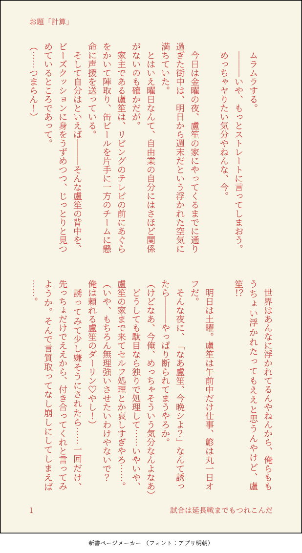 つなみ☆quiet followDONE #ささろワンドロライ 10月5日お題「計算」できてるささろ。すけべな下ネタ注意。下心ありまくりで盧笙に構ってほしい簓の話。今絶賛原稿中ではあるのですが、やっぱりドロライには参加したいので……ということでいつもより短め(これは計算通り)(まさにお題通り) #ささろワンドロライ #簓盧 #ささろ sasaro show all(+3 images) Tap to full screen (size:618x1132).Repost is prohibited Let's send reactions! freqpopularsnackothersPayment processing Replies from the creator Follow creator you care about!☆quiet follow つなみDONE #ささろワンドロライ2025/09/13課題「力」今回初めて「コマの上にキャラを描く」やり方を知りました…これやってみたかったんだよなあ つなみDONE #ささろワンドロライ2025/09/06課題「暇」 つなみDONE #ささろワンドロライ2025/08/30課題「間に合う」 つなみDONE #ささろワンドロライ2025/08/23課題「怪談」※8/27追記零のひげを描き忘れてて描き足しました…なんでそんなとこ描き忘れた!?今更気づいた自分にショック…… つなみDONE #ささろワンドロライ2025/08/16課題「合鍵」のボツver.です。せっかくなのでここで供養…。仕上げてみないと分からないのホント不思議。 つなみDONE #ささろワンドロライ2025/08/16課題「合鍵」 related works つなみDONE #ささろワンドロライ 5月4日お題「初夏」できたてのささろ。翌朝色々思い出して1人でもだもだしている盧笙の話。簓はあまり出てきません。あとほんの少しだけ零もいます。 8 つなみDONE #ささろワンドロライ 10月21日お題「おねだり」できてないささろです。ついつい簓のわがままをきいてやってしまう盧笙の話。 8 chatakeDOODLEお題「知りたい」+1.5hささらのカレーメシ動画がちょうどアップされた日だったので無理矢理絡めました 2 chatakeDONEお題「おやすみ」 つなみDONE #ささろワンドロライ 11月4日お題+15分「はえる」(映える)(4/全8頁)できてるけれど次の関係に進むのにためらっている2人の話。・途中上とか下とかの話をしますが、最初から最後までささろです。・冒頭と最後にモブが出ます。 8 ああやDONE #ささろワンドロライ第115回「こたえる(漢字変換自由)」相互理解って難しいけどそれでもいいと思うお話。シリアスではないですがちょい暗。 3125 つなみDONE #ささろワンドロライ 1月6日お題「あかり」両片思いのささろ。間違いなく両想いですが、若干すれ違い気味です。恋心を自覚した🧑🏫が思い悩む話。通りすがりのモブと0️⃣が少しだけしゃべります。 9 つなみDONE #ささろワンドロライ7月29日お題「携帯」aba直後くらい、まだ若干ぎくしゃくしているささ→ろ。簓は意識済の片想い状態です。暑い中、盧笙の部屋でダラダラしている2人の話。作中のアレの話。どうでもいいけど、一応検索してみて地域特有の言い方ではなかったぽいので、こんな感じにしてみましたが、やっぱろしょーにはちゅーちゅー言って欲しい……可愛いので……。 7 ああやDONE #ささろワンドロライ 第120回「爆発」 (+0.5h)アホギャグ。れー視点 1909 recommended works みゃーたの落書き帳DOODLEささろワンドロ EAst3368DOODLE😋 おにくお そうめんTRAINING斎山SS カルデア時空 HENTAI 単衣を単って誤字がある 肘を膝って誤字がある 6 ヨル@壁打ちDONEあかん子やなぁ/ささろ chatakeDOODLE酔っ払いのささろ gk_hp336DOODLEこの後押し倒されるやつ gk_hp336PROGRESS塗りかけだけどこんな表紙の本が出せたらいいな やすみ先生DONEワンドロチャンジ レトロかわいいササラとロショ~ つなみDONE #ささろワンドロライ 7月8日お題「溺愛」無自覚同士の🎋と🧑🏫。0️⃣視点です。お互い無自覚なのに執着しあっていてドン引きしている0️⃣の話。関係ない話。やたらと3人にビールを飲ませてしまうんですが、私自身はハイボール党です……。あと、フルーツビール私は好きです。あと🎋は戻ってきてからタバコほとんど吸ってないけど、たまーに苛ついて吸ってるイメージ(ほぼ🧑🏫絡み) 8
