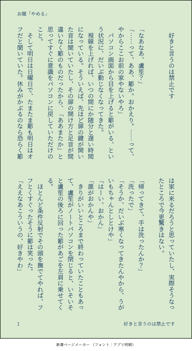 つなみ☆quiet followDONE #ささろワンドロライ 11月18日お題「やめる」できてるささろ。いちゃいちゃしてます。好き好き言う簓に耐えかねてそのワードを禁止する盧笙の話。 #ささろワンドロライ #ささろ sasaro show all(+6 images) Tap to full screen (size:618x1132).Repost is prohibited Let's send reactions! freqpopularsnackothersPayment processing Replies from the creator Follow creator you care about!☆quiet follow つなみDONE #ささろワンドロライ2025/09/13課題「力」今回初めて「コマの上にキャラを描く」やり方を知りました…これやってみたかったんだよなあ つなみDONE #ささろワンドロライ2025/09/06課題「暇」 つなみDONE #ささろワンドロライ2025/08/30課題「間に合う」 つなみDONE #ささろワンドロライ2025/08/23課題「怪談」※8/27追記零のひげを描き忘れてて描き足しました…なんでそんなとこ描き忘れた!?今更気づいた自分にショック…… つなみDONE #ささろワンドロライ2025/08/16課題「合鍵」のボツver.です。せっかくなのでここで供養…。仕上げてみないと分からないのホント不思議。 つなみDONE #ささろワンドロライ2025/08/16課題「合鍵」 related works つなみDONE #ささろワンドロライ 1月6日お題「あかり」両片思いのささろ。間違いなく両想いですが、若干すれ違い気味です。恋心を自覚した🧑🏫が思い悩む話。通りすがりのモブと0️⃣が少しだけしゃべります。 9 chatakeDONEお題「おやすみ」 つなみDONE #ささろワンドロライ 11月4日お題+15分「はえる」(映える)(4/全8頁)できてるけれど次の関係に進むのにためらっている2人の話。・途中上とか下とかの話をしますが、最初から最後までささろです。・冒頭と最後にモブが出ます。 8 ああやDONE #ささろワンドロライ第115回「こたえる(漢字変換自由)」相互理解って難しいけどそれでもいいと思うお話。シリアスではないですがちょい暗。 3125 つなみDONE #ささろワンドロライ 10月21日お題「おねだり」できてないささろです。ついつい簓のわがままをきいてやってしまう盧笙の話。 8 chatakeDOODLEお題「知りたい」+1.5hささらのカレーメシ動画がちょうどアップされた日だったので無理矢理絡めました 2 つなみDONE #ささろワンドロライ 5月4日お題「初夏」できたてのささろ。翌朝色々思い出して1人でもだもだしている盧笙の話。簓はあまり出てきません。あとほんの少しだけ零もいます。 8 つなみDONE #ささろワンドロライ7月29日お題「携帯」aba直後くらい、まだ若干ぎくしゃくしているささ→ろ。簓は意識済の片想い状態です。暑い中、盧笙の部屋でダラダラしている2人の話。作中のアレの話。どうでもいいけど、一応検索してみて地域特有の言い方ではなかったぽいので、こんな感じにしてみましたが、やっぱろしょーにはちゅーちゅー言って欲しい……可愛いので……。 7 ああやDONE #ささろワンドロライ 第120回「爆発」 (+0.5h)アホギャグ。れー視点 1909 recommended works gura16sDOODLEなんかに大喜びして馬乗りする🎋と満面の笑みにしゃあないなあって一緒に喜ぶ👨🏫 ondoredesuPASTサ(24)とロ(10)の絵 2 humhum_niMOURNINGささろ寸止めのやつ(文字なし 勘解太PASTasbaで少年漫画をしすぎた反動で少女漫画になってしまったささろとおいちゃん 2021年3月にあげた漫画です 3 勘解太PAST使用者の精神が不安定だと動作不良を起こすスピーカーと、大雨が降った翌日の簓2021年9月にあげた絵です charmy_lllDOODLE viikaviDONEI finished my #Sukuita dj!💕• R18• 48 pages- You can write to me personally and pay via paypal✨- Or pay through this site: https://www.buymeacoffee.com/viikavi 2 0nisimaDONEささろフェス🎃ささろ漫画まとめ全部Twitterかポイピクに上がってるので、まとめて見たい人向けいろいろ注意高校生閲覧不可貴方は18歳以上ですか?(y/n) 31 もっこDOODLEささろ いっしょに あそぼチエンさん(@tyn5op)との合作です。簓と盧笙が一緒に遊んでる…っていう、まあそういう話です。なんでも許せる人!!!よろしく!! 12