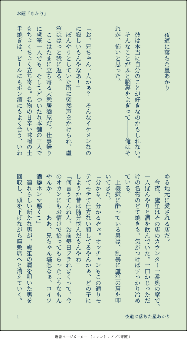 つなみ☆quiet followDONE #ささろワンドロライ 1月6日お題「あかり」両片思いのささろ。間違いなく両想いですが、若干すれ違い気味です。恋心を自覚した🧑🏫が思い悩む話。通りすがりのモブと0️⃣が少しだけしゃべります。 #ささろワンドロライ #ささろ sasaro show all(+8 images) Tap to full screen (size:618x1132).Repost is prohibited Let's send reactions! freqpopularsnackothersPayment processing Replies from the creator Follow creator you care about!☆quiet follow つなみDONE #ささろワンドロライ2025/09/13課題「力」今回初めて「コマの上にキャラを描く」やり方を知りました…これやってみたかったんだよなあ つなみDONE #ささろワンドロライ2025/09/06課題「暇」 つなみDONE #ささろワンドロライ2025/08/30課題「間に合う」 つなみDONE #ささろワンドロライ2025/08/23課題「怪談」※8/27追記零のひげを描き忘れてて描き足しました…なんでそんなとこ描き忘れた!?今更気づいた自分にショック…… つなみDONE #ささろワンドロライ2025/08/16課題「合鍵」のボツver.です。せっかくなのでここで供養…。仕上げてみないと分からないのホント不思議。 つなみDONE #ささろワンドロライ2025/08/16課題「合鍵」 related works つなみDONE #ささろワンドロライ7月29日お題「携帯」aba直後くらい、まだ若干ぎくしゃくしているささ→ろ。簓は意識済の片想い状態です。暑い中、盧笙の部屋でダラダラしている2人の話。作中のアレの話。どうでもいいけど、一応検索してみて地域特有の言い方ではなかったぽいので、こんな感じにしてみましたが、やっぱろしょーにはちゅーちゅー言って欲しい……可愛いので……。 7 ああやDONE #ささろワンドロライ第115回「こたえる(漢字変換自由)」相互理解って難しいけどそれでもいいと思うお話。シリアスではないですがちょい暗。ふしぎノクターン簓は時々不思議なことを言う。 その度盧笙はどう答えて良いのか迷い、とりあえずぱっと浮かんだ言葉を返す。スピード感ある会話はオオサカ人のウリやから。いや知らんけど。 そして簓が吐いた言葉は盧笙の頭の中どこかを縛り付けて、『あん時何てコメントすればよかったんやろうなぁ』と盧笙は悩むことになる。 『コンビ組んでた頃はこんなこと無かってん。いつからやろ、あんなん言い出し始めたんは。』と更に悩みは深くなり泥沼化。 一方、簓はその不思議な言葉を言う時も言った後も『え、俺なんか言うた?なんも変な事言うてへんよ、今日も無敵でパワフルなぬるさらちゃんですよ』という態度を取るので、あれかなもうええんかな、と盧笙が忘れたふりをしていると、またそのうち不意打ち、不思議な事を吐くのでまた盧笙はぽけーっとなってしまう。 3125 つなみDONE #ささろワンドロライ 10月21日お題「おねだり」できてないささろです。ついつい簓のわがままをきいてやってしまう盧笙の話。 8 chatakeDONEお題「おやすみ」 つなみDONE #ささろワンドロライ 1月6日お題「あかり」両片思いのささろ。間違いなく両想いですが、若干すれ違い気味です。恋心を自覚した🧑🏫が思い悩む話。通りすがりのモブと0️⃣が少しだけしゃべります。 9 chatakeDOODLEお題「知りたい」+1.5hささらのカレーメシ動画がちょうどアップされた日だったので無理矢理絡めました 2 つなみDONE #ささろワンドロライ 5月4日お題「初夏」できたてのささろ。翌朝色々思い出して1人でもだもだしている盧笙の話。簓はあまり出てきません。あとほんの少しだけ零もいます。 8 ああやDONE #ささろワンドロライ 第120回「爆発」 (+0.5h)アホギャグ。れー視点つまりバブでオギャ『…零昨日家来た?』 零のスマホに盧笙から着信有り。 通話ボタンをタップするともしもしもなく開口一番、盧笙はそう言った。 零はニヤリと笑みを浮かべた。内心大変愉快だ。 「いや?」 『あ、そう…』 「なんかあったのか?」 声はややシリアスめなトーンで、でも顔は依然としてニヤニヤしたまま零は言葉を返した。 何故なら零は昨夜の事情を知ってるからである。まぁ、ただ嘘は吐いていない。零は昨夜盧笙の家に行っていない。簓に誘われていたが東都にいたので断った。 ただ簓から電話はあった。大変酔っていた。盧笙も、簓も。 『いや、あー…』 「痴話喧嘩か?」 『いや、…なんて言うたらええんか…』 電話の向こうで盧笙は言葉を濁す。 『結論から先言うと、…昨日のこと全然、覚えてへんねん』 1909 つなみDONE #ささろワンドロライ 11月4日お題+15分「はえる」(映える)(4/全8頁)できてるけれど次の関係に進むのにためらっている2人の話。・途中上とか下とかの話をしますが、最初から最後までささろです。・冒頭と最後にモブが出ます。 8 recommended works とらおMAIKING投稿テスト用女の子の顔描きなれてないから難しいね kTm勝間 羚(a.k.a空音)DOODLEささろ(♀)でショタおね①【ももとばなな】 3 ウサヒゲPROGRESS ユリマサアヲルPROGRESSロショ先生のチョーカー忘れるところだった表紙は先に終わらせておけば良い先代の知恵 ヨル@壁打ちDONEあかん子やなぁ/ささろ 勘解太PAST本