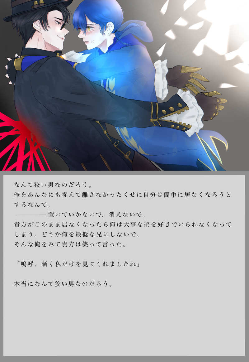私の探傭界では赤と明は兄弟で赤にとってモグは大好きな明を連れ去った1番嫌いな人間なのでいつか殺しにきそうだなぁ、から生まれたイラストです。