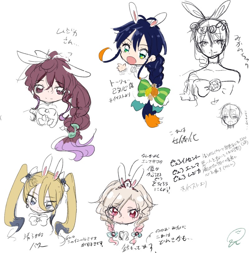 エンマちゃんのティアラは割とすぐ出てきたアイデアなんですが、イノセントとムジカが概念過ぎて…イノセントは初代のホワイト的な感じで白ベースに昂輝のイメージで✨を入れようかなぁ…ムジカさんは音符を散らすかなぁ???藤も入れたいかもしれません…