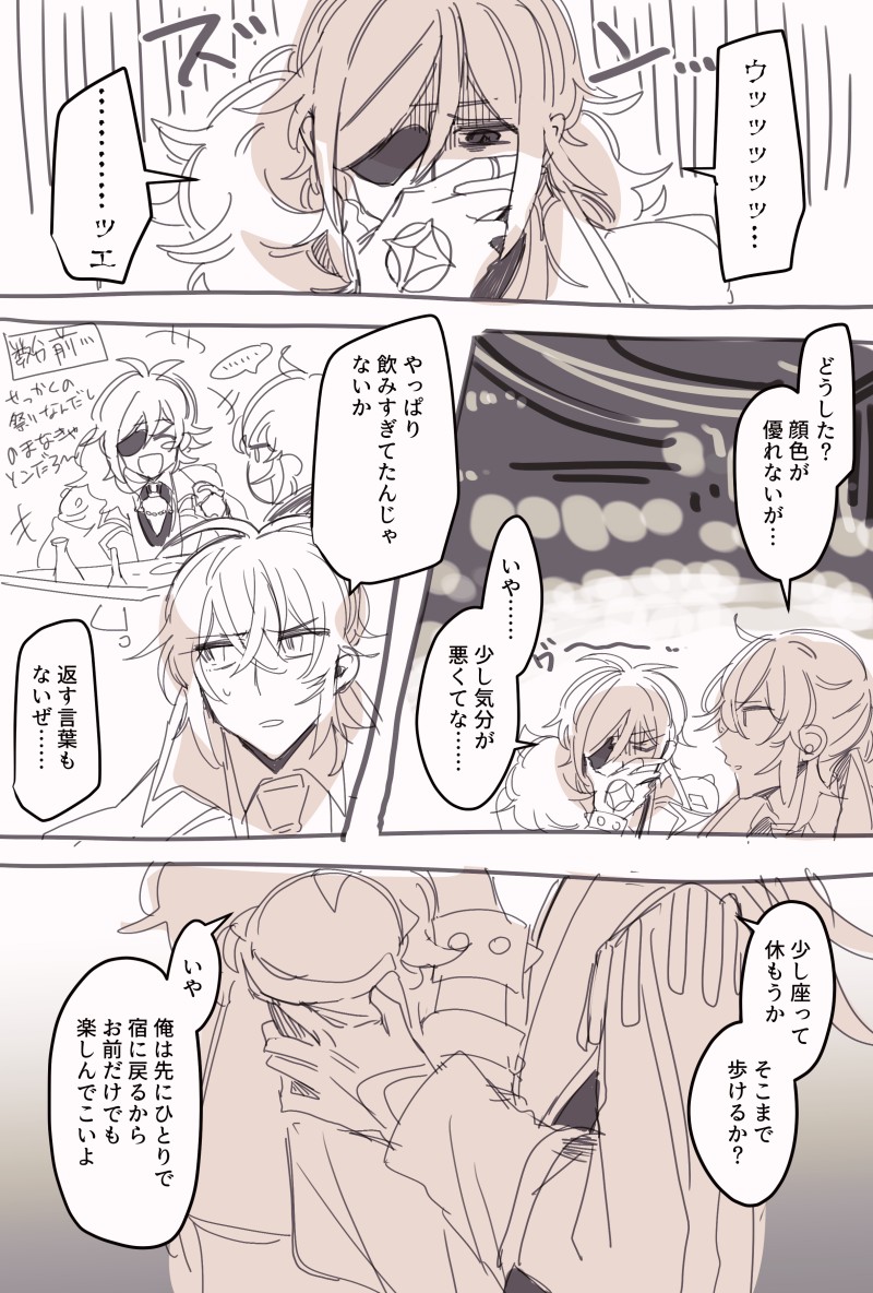 海灯祭デートする謎時空のハッピーディルガイらくがき漫画です。ガイアさんは慣れないりーゆえの酒を飲み過ぎて悪酔いしてほしいしディルックさんは一番グレード高い宿を確保してほしいなと思います。