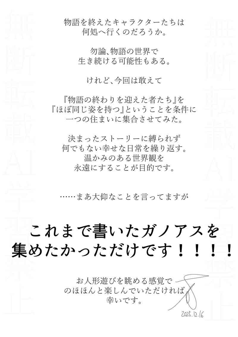 tjoue0202☆quiet followDONE『メゾンドトパーズ』とはこれまで私が書いて(描いて)きたガノアスちゃんたちが集まって暮らしているアパートを舞台に、占い師と厄災(魔王)がほのぼの(時々バチバチ)している不定期漫画シリーズです。まずはこちらの設定からご覧ください。 ##メゾンドトパーズ show all(+2 images) Tap to full screen (size:2152x3044).Repost is prohibited Let's send reactions! freqpopularsnackothersPayment processing Replies from the creator Follow creator you care about!☆quiet follow tjoue0202DONE【ネタバレ注意】フリーゲーム『ヘビの命』をクリアしましたッ……!!!!! tjoue0202DONEアストルちゃんの恋愛観によって『○○しないと出られない部屋』に閉じ込められてしまった、ご先祖アッくんとティアガノ様。果たして二人の運命やいかに……現在3ページまで完成(続きます) 3 tjoue0202DONE怪人「王妃殺しとはそりが合わん」ティア「ハイラルの王妃なんぞに心を寄せる奴の気が知れん」大家アス「いい加減にしてください!!!」 tjoue0202DONE『メゾンドトパーズ』とはこれまで私が書いて(描いて)きたガノアスちゃんたちが集まって暮らしているアパートを舞台に、占い師と厄災(魔王)がほのぼの(時々バチバチ)している不定期漫画シリーズです。まずはこちらの設定からご覧ください。 3 tjoue0202DOODLE「おはようございます今日にもアストル君がプレイアブル化するといいな!」略して「おはアス」の2026年版①です(1月1日~)手 7 tjoue0202DONE新年あけましておめでとうございます。今年もよろしくお願いします。ゲルドから見える日の出はこんな感じなんだろうと思いながら描きました😌 recommended works たるとDOODLE4.デートに行く随分前にも同じようなの描いたけど……。いいんだよこれはもうデートなんだよサバイバルデート。 たるとDOODLE【再チャレンジ】5.キスをする(うちの2人は)これが精一杯。最初のチャレンジは自分で描いてて「酷いな……(私自身の当初の目的からかけ離れてる)」と色々と思うことがあってリベンジ。(しがらみから開放されたい……けど順番を追っていかないと無理矢理感が出て何か微妙になるというジレンマ) 2 たるとDOODLE7.コスプレ普段とあまり変わらなかった……。ジュナイパーなのはアモン(フクロウ)繋がり。 たるとDOODLE8.買い物財布は彼女が握ってる。自分で描いてて何ですけどこんなんじゃ人間界に帰っても嫁のもらい手が無いと思うので責任とって欲しい。 カズルMOURNING #30日CPチャレンジ①蘭嶺/嶺蘭1.手をつなぐ2.抱きしめる3.映画を見る4.デートに行く5.キスをする6.衣装交換7.コスプレ(女装⚠️)8.買い物9.友達と(みんなで)遊ぶ10.獣耳枚数あるものも有り、見づらくてすんません。 14 山田けんげんDOODLEルシシアで30日CPチャレンジまとめ 34 youya_sousakuTRAINING【30日CPチャレンジ/6日目】衣装交換「これは、やめといた方が良いんじゃねえかな…」 youya_sousakuTRAINING【30日CPチャレンジ/7日目】コスプレ「こういうのは、おめえさんの方が似合うと思うんだがなあ…」 youya_sousakuTRAINING【30日CPチャレンジ】買い物「ちょっとバーの酒分けてもらっただけなのにこの買い物の量は納得いかねえ」