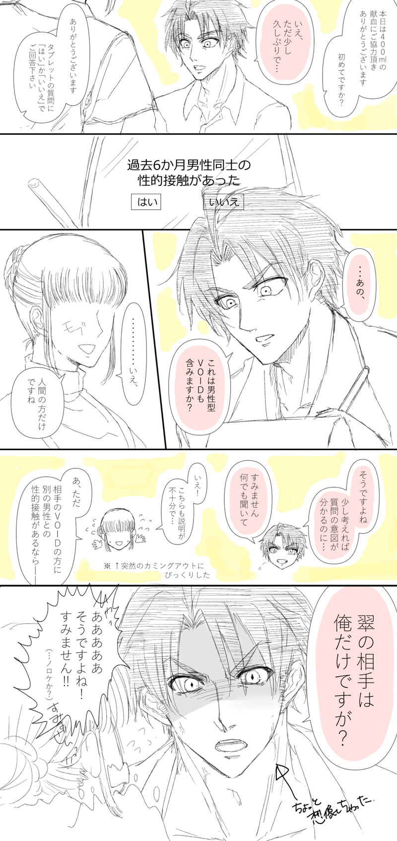 cur1ing43☆quiet followDOODLE「伸親と献血」※VOID自陣 ※ネタバレなし※HO3とHO4に性的な関係のある世界戦このあと、外で待っていた翠は献血センター中の看護師さんに暖かい目で見られるし伸親にキレる Tap to full screen (size:1058x2240).Repost is prohibited Let's send reactions! freqpopularsnackothersPayment processing Replies from the creator Follow creator you care about!☆quiet follow cur1ing43DOODLE cur1ing43DOODLE※プル夜自陣※バレなし、ネタ元は相方のツイート 2 cur1ing43DOODLE※同居人、X2U(探偵×助手)自陣※3枚目のワンクッション後は両シナリオのネタバレ含むので注意 5 cur1ing43DONE※プル夜 HO2ショタ差分※6枚目(にっこり頬紅の次)は怪我注意 6 cur1ing43DOODLE※快刀乱魔 HO3とHO4とモブ女※ネタバレはないと思う 2 cur1ing43DOODLE※VOIDうちよそ※HO3とHO4に肉体関係がある※細かいこと考えてない 2 recommended works つくし/まるおTMP-SAVE #ヒロアカ #腐向け #轟焦凍 #夜嵐イナサ #イナ轟イナ轟のオメガバース つくし/まるおTMP-SAVE #ヒロアカ #腐向け #轟焦凍 #夜嵐イナサ #イナ轟 つくし/まるおPAST #ヒロアカ #轟焦凍 #夜嵐イナサ #腐向け #イナ轟 創(はじめ)DONEイナ轟描いてみた毎日絵をあげます cur1ing43DOODLE全部終わったら本人より号泣しながら迎えに来て欲しい s_kmtjjtDOODLE五直 nyaaaaan__0302DOODLEおぱんち隊 yachiyacchacchaSPOILERなぜか描いたマグロ漁船のスチル(?) 休憩所MOURNINGさくことこういうシチュが好きなだけです…