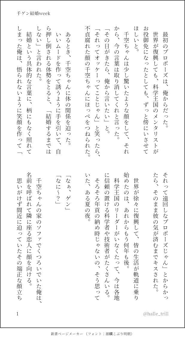 トリル☆quiet followDOODLE素敵な千ゲ結婚タグ用に書いたもの。ログとして残しておきます show all(+2 images) Tap to full screen (size:618x1132).Repost is prohibited Let's send reactions! freqpopularsnackothersPayment processing Replies from the creator Follow creator you care about!☆quiet follow トリルDOODLE復興後if千ゲ※R18お題→本当の「やめて」ではない「やめて」もあるし、プレイ中のセーフワードを一緒に考えることにした千とゲ 9758 トリルDOODLE素敵な千ゲ結婚タグ用に書いたもの。ログとして残しておきます 3 トリルDOODLE造船中千ゲ半自覚千と酔ってるゲ 10000 トリルDOODLE造船中千ゲゲが風邪ひく話 6442 トリルDOODLEお互いチョロいと思ってる千ゲン トリルDOODLE千ゲン天文台プレゼントした日のお話無自覚千←←←片想いゲというのが好きすぎて…早く幸せになってください 4788 recommended works あじ塩MOURNING克烈、というか克←烈多め 9 ymzknlDOODLE降志8 17 ぬめりとりDONE毎日がバニーの日なので、バニーさんの格好してえっちするだけのレイチュリ。⚠︎頭の良い二人は居ません。pass→18↑?(y/n) 3973 SairleBDOODLE 2 アキ(あくねこ垢)DONE2024年ルカス誕生日絵執事+執事イメージの鳥ルカスとヘビクイワシ はちみつDONE天フェス用に描いていた作品途中です自慰行為あります何でも許せる方向けですメディアミックスです成人済みですか? 8 TSU.MENU12/15 神ノ叡智22 罪人律し裁く者リオヌヴィ新刊/成人向け🔞A5/28p/R18/¥400-🌧がお疲れな⛓️のために身体で労うお話です(二本立て)※サンプル画像は繋がっていません※成人済みですか?/Are you over 18?(y/n) 7 かがりPROGRESSお約束のれめゆみです。 5876 matsuneoDOODLE20241208
