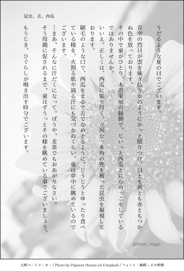 frost_ringo☆quiet followTRAINING文章の練習(三題噺/オリジナル)お題:昆虫、舌、西瓜 Tap to full screen (size:630x928).Repost is prohibited Let's send reactions! freqpopularsnackothersPayment processing Replies from the creator Follow creator you care about!☆quiet follow frost_ringoDONE大変お待たせいたしました…!!!マロリクのイラストです🦊 2 frost_ringoDONEマロのリクエスト消化しました!!🦊 2 frost_ringoMAIKING【感想】仮面ライダーエグゼイド_36話〜最終話やっとこさ完走しました。総評的感想ですが、記録として。。。(2021/03/16) 617 frost_ringoMAIKING【LHLV/短文】書きたいシーンだけ書いた強烈な幻覚。超個人解釈なのでワンクッション。 873 frost_ringoMEMO【感想】仮面ライダーエグゼイド_31話〜35話クセ祭り。 762 frost_ringoMEMO【感想】仮面ライダーエグゼイドだか_27話〜30話全然感想用に2回目見てるのが遅れてるので、初見感想進めることにしました。 508 recommended works sumewanDOODLE弱ペダ五巻目です。ほんと、夜にちゃんと撮れないの、ストレス…! frost_ringoMOURNING【感想】仮面ライダーエグゼイド_1話各話ごと、キャラごとに気になったこと、感じたことを好き勝手書いていきます。※26話まではすでに視聴済みなので、初回と違い、新鮮ではない感想の可能性がありますが、なるべく初回視聴時に感じたことを書いていきます。 1060 frost_ringoMOURNING【感想】仮面ライダーエグゼイド_7話各話ごと、キャラごとに気になったこと、感じたことを好き勝手書いていきます。※26話まではすでに視聴済みなので、初回と違い、新鮮ではない感想の可能性がありますが、なるべく初回視聴時に感じたことを書いていきます。 1135 frost_ringoMOURNING【感想】仮面ライダーエグゼイド_8話各話ごと、キャラごとに気になったこと、感じたことを好き勝手書いていきます。※26話まではすでに視聴済みなので、初回と違い、新鮮ではない感想の可能性がありますが、なるべく初回視聴時に感じたことを書いていきます。 1213 shishamon2525MEMO金カム初読感想という名のただの叫び(1巻〜10巻)。5巻あたりから読みながらメモしてます。 7 みかん女SPUR MEバナナフィッシュの感想とか見終わった後の妄想やらifやらを語っています。ネタバレあるので気を付けてください。 2406 えちゃんDONE模写したエグゼイド の永夢くんです。目がきらきらな感じが気に入っています。 時国くるっぷ@tokuniSPOILERハガレン舞台の感想。楽しかった。 839 怨霊ねこMOURNING第26話初見実況ですよ手が震えてるしまだ身体が寒いんですけどどうしてくれる荒ぶる怨霊になっちまうぞ 1347