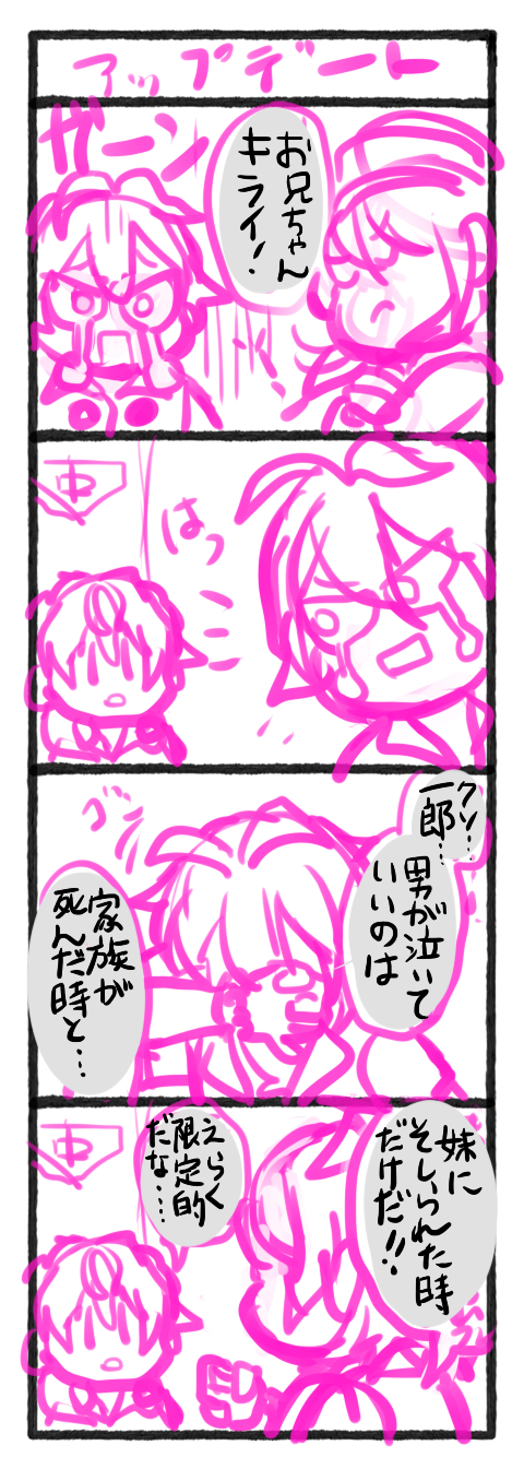ぎょうざ座☆quiet followMOURNING半年~1年ほど前?に描いてボツにした4コマ(字は読めなかったのでさっき書き直したけどやっぱり読めない)思いついて反射的に描いたはいいものの、この時の左馬刻は一郎のことを「妹を唆したクソ偽善者野郎」だと思っているので、いくらギャグでもこの反応は有り得ないなと解釈不一致を起こしたのでお蔵入りです。 Tap to full screen (size:480x1345).Repost is prohibited Let's send reactions! freqpopularsnackothersPayment processing Replies from the creator Follow creator you care about!☆quiet follow ぎょうざ座PROGRESSヒプの6歳の誕生日イラストが間に合わない完成したら消します(完成するのか??) ぎょうざ座MEMO目の色正解バージョン。一郎ソロの試聴の順番が来るのが怖くて楽しみ!!(ツイに上げた方は誤りです。たぶん初めて逆にしてしまったかもしれない。。) ぎょうざ座MEMO以前山田家絵チャにお邪魔させて頂いたときに描いたものです左右反転と拡大縮小を封じられると全っっっ然描けない…!!! 3 ぎょうざ座MEMO年賀状ボツバージョン(人参をイメージした色)印はこっちの位置の方が良かったかも一郎のピアス穴描き忘れたのが悔やまれる。。。ブクロの成長について一郎は助走、二郎は最初の踏み込み大ジャンプ、三郎はより遠くまで飛ばせることが役割のイメージなので落とし込んでみました。2023年の活躍も期待してます!!!!!!! ぎょうざ座MEMO金のさぶちゃん(グラデーションマップで遊んでただけ…)指揮者のイメージで描いてたけど途中で魔法使いなフォーティーンっぽくなっていったスピーカー描いてて初めて気付いたんだけど三郎のスピーカーのてっぺんに🦉いるんだね、可愛い…所々にあしらわれてる羽モチーフも🦉の羽だと思うと可愛い ぎょうざ座MOURNING空却誕ボツ迷走すると脱がす癖があるっぽい↓やっぱり他に思いつかないので少し変えて仕上げるかも… recommended works kisa010712PROGRESS #山田三郎#ヒプノシスマイク chijin14PAST #ヒプノシスマイク#伊弉冉一二三 UmioDOODLE ときややのPROGRESSラフ♡ もよりDOODLE きむらDOODLEピアスとしっぽ忘れた ひか☻ぷほいPASTまてんろ ししゃもDOODLEシンジュクのアサシン#ヒプノシスマイク #ヒプマイ #神宮寺寂雷 あ たにDONE