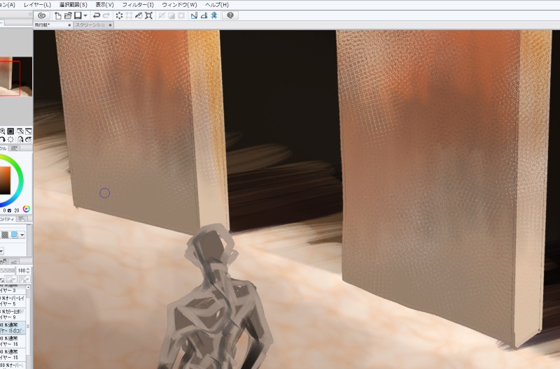 ご機嫌なブラシを見つけたので落書きをしているが落としこみ方がわからずに迷走をつづけて約2時間…謎光源はいつものことだけどここに人物をどう描きこめばよいのやら。いつも絵じゃ浮きそう。うーん。