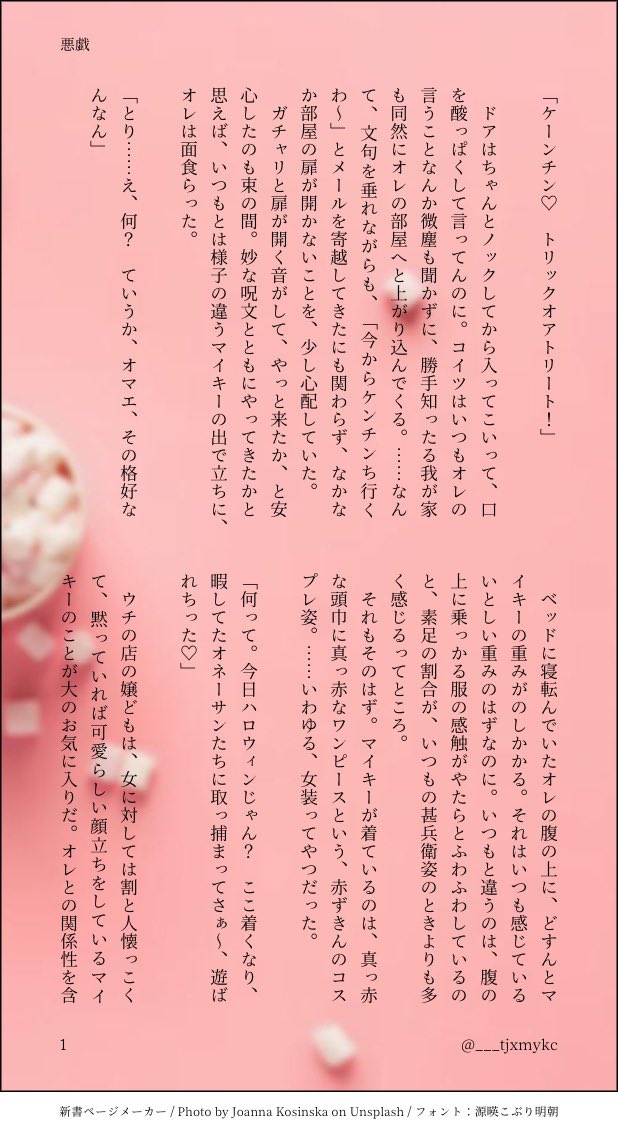 ___tjxmykc☆quiet followPASTドラマイワンウィーク「悪戯」ハロウィンの定番!って感じのドラマイです。ひたすらラブラブなドマを目指して書きました。 #ドラマイ drabai #ずっドマ! show all(+4 images) Tap to full screen (size:618x1132).Repost is prohibited Let's send reactions! freqpopularsnackothersPayment processing Replies from the creator Follow creator you care about!☆quiet follow ___tjxmykcDONE2023/10/1、ドラマイの日おめでとう〜❤️ということで、ドラマイのラブコメを書いてみました。自分の体の変化にとまどうマと、八つ当たりを受けるドのお話です。前半部分までしか書けてないですが、後半のえっちはpixivにあげる予定です〜前半もR18のため、18歳未満の方の閲覧はご遠慮ください。パスワードあなたは18歳以上ですか?【yes or no】 8 ___tjxmykcMOURNING2023/8/27 DrasticreMind4 で配布したドラマイ小話。先天性女体化マイキーとうぶケンチンのもだもだ初夜(未遂)です!もしよければあとがきまで見てやってください🩷 9 ___tjxmykcPAST○○しないと出られない部屋(ドラマイワンウィーク「密室」おなじみシチュエーションながら、エロいことは何一つしていないです。梵天軸イメージでどうぞ。 10 ___tjxmykcPASTドラマイワンウィーク「寝言」「甘やかす」酔っ払いケンチンがマイキーに甘えまくります。かっこいいケンチン(と翳りのある一虎くん)はいません! 5 ___tjxmykcPAST猫(ドラマイワンウィーク「ペット」)梵天軸でタケミっちとマイキーがボウリング場から飛び降りたあと、ふたりとも助からなかった世界で後悔を抱えながら生きるケンチンの話です。原作に沿っているとはいえ、死ネタとなりますのでご注意ください。最近書いた話の中でも特に気に入っているお話です。 9 ___tjxmykcPASTドラマイワンウィーク「悪戯」ハロウィンの定番!って感じのドラマイです。ひたすらラブラブなドマを目指して書きました。 5 related works tiqki ▶MENU続き(Part2)⚠完全に私の語りで草。 813 komomoDONE2枚目はふぃりぴん闇堕ちのときの…過去…(?)伝われ……刈り上げであってるかな…ちふゅみたいになってしまった… 2 ガリ勉MOURNINGリベキャラをだるま化するという謎の作業を行なっていた1月初頭…。 11 ぐみ(ポイピク)DOODLEドラマイ四十八手ネタぬるいですが18禁微妙に違う四十八手のカブってる体位を、マイキーに身体で覚えてもらうだけ☺️ アイ卍DONEドラマイえち(18歳未満禁)Drakey manga:Only for 18 and older.English version follows Japanese version. 13 アイ卍DOODLEドラマイ♀らくがき「…もうしよ ケンチン」⚠️マイキー女体化(04/21/2024) 2 xxxmakimnchixxxDONEまいちーくんのお誕生日漫画。めでたさゼロ。とにかく平和。でも喧嘩はする。 14 しの(sino)DOODLEいいおっぱいの日まいち 2 ぐり-ERAREDOODLEドマ短編『ある寒い日の』 7 recommended works shiranami_a3DONE水曜日(深夜含む)はドラマイ(を描きたくなる)の日Part2行き過ぎた現実逃避により肌色多めになりました…が、2人が幸せな世界線にいるなら何でも良い…!肌色多めがどこまで許容されるかわからなかったのでポイピグに入れ直しました💦 hamanoyonkoDONEドラマイ 翠蓮*PAST大体、旧→新。gif差分あり。30枚ペースで纏めています😊 30 bfytasoINFO【ドラマイ】新刊案内『once again』R18 龍♥寺堅×佐野万♥郎※通販のみ。イベント頒布はありません。◆とらのあな↓https://ec.toranoana.jp/joshi_r/ec/item/040030964477◆BOOTH(自家通販)↓ https://pinkblood.booth.pm/items/3615092完全描き下ろしによる【梵天軸】ドラマイ 6 fukuske5050MOURNING大幅に遅刻して大幅に湾曲してるのでタグなしで気持ちだけ参加させてください…😣ドラマイ/マイドラお題「我儘」 2612 fukuske5050REHABILIエマちゃんとマがいちごを煮てるだけ途中からなにを書いているのか…🤔自分でできない料理ネタはもう二度と手を出さないと決めました…ちょこっとドラマイドラ 4446 Pessy_LujiDONE類寧々 | 神のまにまに(随神之侧)*中国語ご注意いただきます自分の妄想パロ、神明 x 際品ワンダショの神のまにまにマジ尊いで思ったから書きました。 5920 dm_novel_INFOドラマイR18小説アンソロジー【オレらの秘密ごっこ】収録作品まこ様 https://www.pixiv.net/users/22383385/novels『まだ帰りたくない』【神社】より一部をご紹介します!※現在通販受付中https://ec.toranoana.jp/joshi_r/ec/item/040030990663/ dm_novel_INFOドラマイR18小説アンソロジー【オレらの秘密ごっこ】収録作品SORA2様 @sora18070674『Like an animal or---?』【動物園】より一部をご紹介します!※現在再販受付中https://ec.toranoana.jp/joshi_r/ec/item/040030990663/