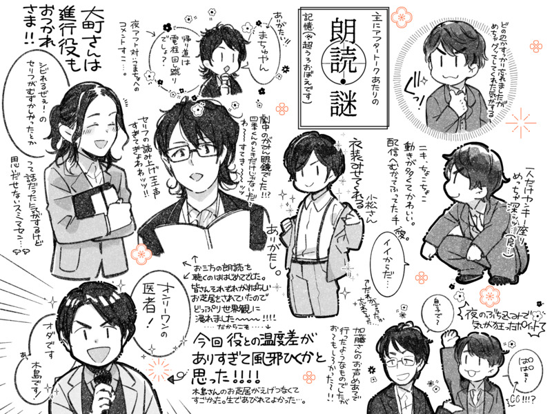 先日行われた朗読謎の簡易レポです!!!記憶が既に飛びまくっているため記憶違いがありましたらすみません〜〜〜!!!(あと似てないのも許されたい)もっとたくさん書きたいことはあったんですが記憶が完全になくなる前に取り急ぎ!セカンドラインさんほんとにありがとう…舞台装置のライティング完璧でした。声優さんたちの生熱量浴びれて楽しかったです!!!!!!