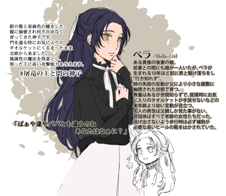 門を通る時にお気に入りのタオルケットにくるまったまま北欧から来ました。風属性の魔法を得意とし、契った王に高い攻撃能力を与えます。」