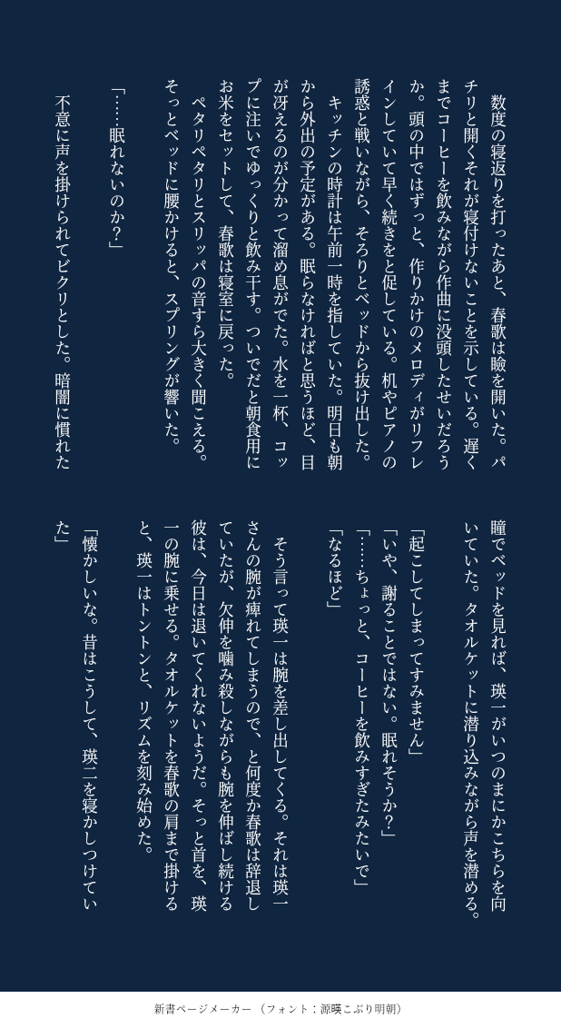 ちひろ(筑前煮)☆quiet followDONEエイトスリー ##瑛一春 show all(+2 images) Tap to full screen (size:618x1132).Repost is prohibited Let's send reactions! freqpopularsnackothersPayment processing Replies from the creator Follow creator you care about!☆quiet follow ちひろ(筑前煮)DOODLE金のメッキが剥がれ落ちても 6 ちひろ(筑前煮)DONE高嶺に置きたい花 4 ちひろ(筑前煮)DONE送り狼 4 ちひろ(筑前煮)DONEサンドイッチ 3 ちひろ(筑前煮)DONETele 4 ちひろ(筑前煮)DONE時にはカーテン 3 recommended works ちひろ(筑前煮)DONEそれはまだ埋まらないピースのひとつ 10 ちひろ(筑前煮)DONEなつやすみだけあればいい 8 ちひろ(筑前煮)DONEもらったワードで書くやつ一目惚れ、耳、足音 3 ちひろ(筑前煮)DONEエイトスリー 3 ちひろ(筑前煮)DONEもらったワードで書くやつ檸檬、跳ねる、視線 3 ちひろ(筑前煮)DOODLEラブストーリーは絆創膏から ちひろ(筑前煮)DONE寝ても醒めても 4 ちひろ(筑前煮)DONE甘さはほどほど地味ハロウィンでした 3 ちひろ(筑前煮)DOODLE遅刻したのでポッキーゲームができない 3