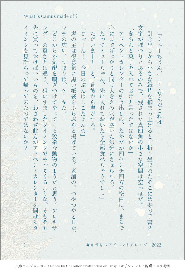 みつき💐🚿☆quiet followDONE12/20 キラキスアドベントカレンダー⛄🎄✨CPあり、左右なし担当:みつき一緒に住んでるということは、お付き合いしてるんだろうなぁ……☺️と思います。タイトルはMother Gooseから。 #キラキスアドベントカレンダー2022 kirakisAdventCalendar2022 show all(+3 images) Tap to full screen (size:630x928).Repost is prohibited Let's send reactions! freqpopularsnackothersPayment processing Replies from the creator Follow creator you care about!☆quiet follow みつき💐🚿DONE5/3プリコン発行 麻酔本💉boostありがとうございました_(._.)_びっくりして幕間をちょこっと書きましたφ(・ω・*)(8ページと9ページの間くらいです)pass:8ページ最後の4文字をアルファベットで 4 みつき💐🚿MOURNING12/20の後日談12/25のCPあり左右なしです。ミューちゃんは、お砂糖と雪と素敵なものでできている 5 みつき💐🚿DONE12/20 キラキスアドベントカレンダー⛄🎄✨CPあり、左右なし担当:みつき一緒に住んでるということは、お付き合いしてるんだろうなぁ……☺️と思います。タイトルはMother Gooseから。 4 みつき💐🚿INFO<投稿例>11/1cpあり左右なしです みつき💐🚿DONEキラキスデイリーメーカーからお題お借りしました🥝🌃✨ (19:09更新)・甘えたい気分のれいちゃんと声が聞きたいミューちゃんがキスをしています。・我慢しているれいちゃんとひそかにごきげんなミューちゃんがキスをしています。#キラkiraDailyキス #shindanmakerカミュ嶺お好きな方はよろしくお願いいたします✨キスはこのあとするとおもいます。pass⇒18歳以上ですか? 7 みつき💐🚿DONEキウイジャムナイト開催おめでとうございます🎉嶺カミュ R-18 SS お題お借りしまして、夏祭りのキラキスです✨足指舐めが平気な人のみお入りください……🙏✨pass:の質問「18歳以上ですか?」⇒yes or no 10 related works urhatokoDONE #キラキスアドベントカレンダー202212月は忙しいけど二人のオフが重なった時にちょっとトクベツなクリスマス!をしてくれる嶺二、祖国へ帰れないカミュと一緒に冬や寒さを楽しもうとしてくれるといいな〜(れいちゃんちのベランダがこんなに小さいわけなくて、これは人目につかない北側の部屋についてる小さいベランダで南向きのリビングには大きいルーフバルコニーもある…といいな) 𝐇𝐚𝐧𝐚INFOめりーくりすます 12月24日 カミュ嶺「むこうにお菓子たくさんあるよ、いかないの?」っていう嶺二の手をつかまえながら、目の前にお前がいるというのにか?という顔のみゅ。 2 みつき💐🚿INFO<投稿例>11/1cpあり左右なしです 𝐇𝐚𝐧𝐚INFO「溶ける指先、交わる体温。」2022.12.07 キラキスアドベントカレンダー カミュ嶺 みつき💐🚿DONE12/20 キラキスアドベントカレンダー⛄🎄✨CPあり、左右なし担当:みつき一緒に住んでるということは、お付き合いしてるんだろうなぁ……☺️と思います。タイトルはMother Gooseから。 4 naganeko_0326DONE嶺カミュ(しっかりデキている) #キラキスアドベントカレンダー2022 9 みつき💐🚿MOURNING12/20の後日談12/25のCPあり左右なしです。ミューちゃんは、お砂糖と雪と素敵なものでできている 5 sarensakaeDONE #キラキスアドベントカレンダー2022#寿嶺二#カミュ recommended works NA2INFOオリジナルキャラでお祝いっ☆ AgatsumaRaineDONEKINKY UZENTOBER 2021 DAY 13 : CONNECTED X NIPPLES PUMP Umi1115TksoDOODLE最低なセルフあみだくじお題【飯トラ:擬似孕ませ】飯トラは夏が似合うねちょっと暗くなりすぎたかも… 1731 houshoudesuDOODLE補佐×創作生徒(椅子ちゃん作) 12 ゴッゴッゲッゴッゲッゴッゲッDOODLEガンダム00のチンポン兵ネーナ・トリニティ mimoza_17490MAIKINGかきかけ〜とりあえずかけた所まで〜続き書きたい〜大人になってからもほし〜!!!pass / 18↑ ?? yes or no 1138 ゴッゴッゲッゴッゲッゴッゲッDOODLEバナマリ受粉スチュワーデス m12snnDOODLEMH部亜種レウチョ×ミツネイサおねショタだから逆に見える…? kirenenkohaiizoDONE初めてのチュウ的な((顔あり🚺がいるよ〜気をつけて〜)) 3