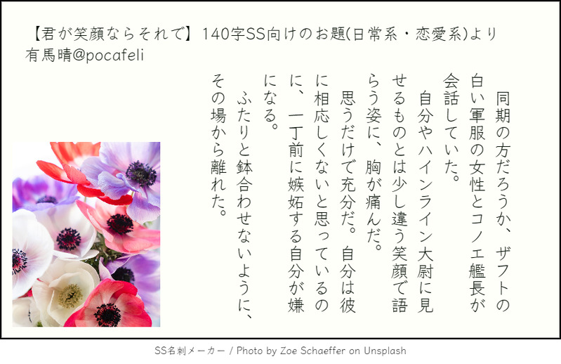 診断メーカーで出たお題を使用して書いた140字SSを、SS名刺メーカー様(https://sscard.monokakitools.net/index.html)で画像化したものを投稿します。