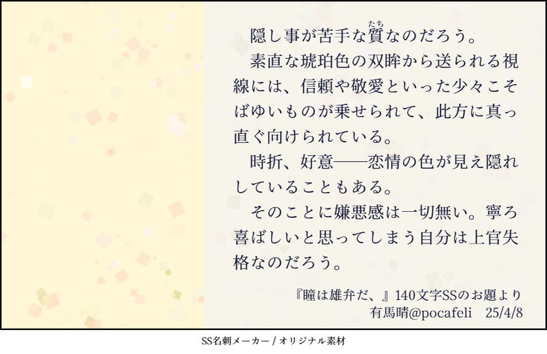 診断メーカーで出たお題を使用して書いた140字SSを、SS名刺メーカー様(https://sscard.monokakitools.net/index.html)で画像化したものを投稿します。