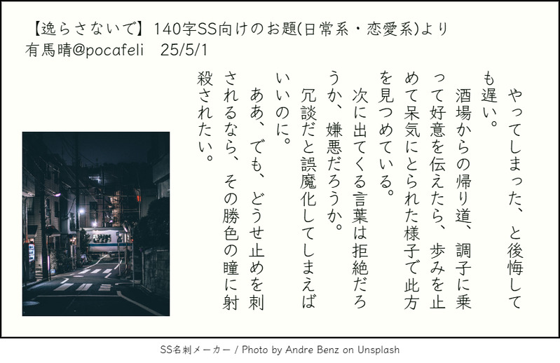 診断メーカーで出たお題を使用して書いた140字SSを、SS名刺メーカー様(https://sscard.monokakitools.net/index.html)で画像化したものを投稿します。
