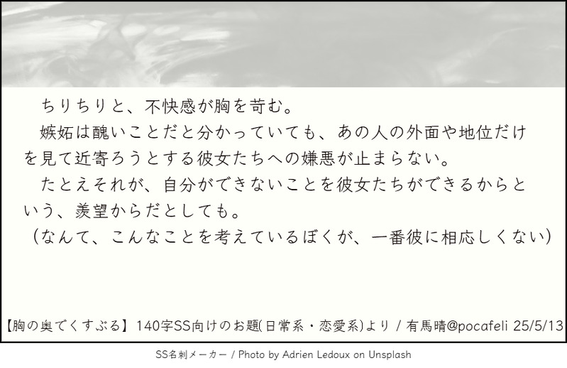 診断メーカーで出たお題を使用して書いた140字SSを、SS名刺メーカー様(https://sscard.monokakitools.net/index.html)で画像化したものを投稿します。