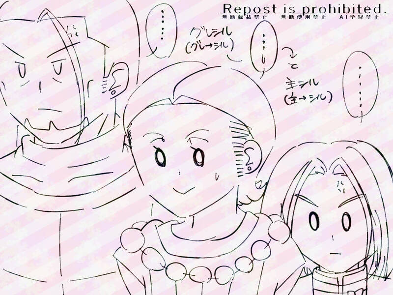 グレシルで主シルの超らくがき(牽制しあう英雄と勇者と変な空気を察するびあ)