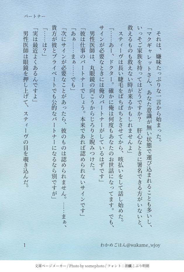 わかめごはん☆quiet followMOURNINGマクダノアンソロのために書いた没作供養です。わんわん、ガルガル、ほのぼのを書いて、ほのぼのを寄稿しました。これはわんわんver.『パートナー』 #H50 #マクダノ mcdano. #ステダノ stedano show all(+13 images) Tap to full screen (size:630x928).Repost is prohibited Let's send reactions! freqpopularsnackothersPayment processing Replies from the creator Follow creator you care about!☆quiet follow わかめごはんCAN’T MAKEちょっと前に書き散らして忘れてた小話。spnにインスパイアされたマクダノです 1425 わかめごはんTRAININGマクダノワンドロとワンライから、過去のお題をお借りしました。 1308 わかめごはんDONE待ちエビ3にてエアスケブのお題を頂いていたのですが、全然書けずにおりまして💦ハタさんお待たせしてすみませんでした!お題:ダニーが作ったもしくは買ってきた〇〇(なんでも)を初めて食べたスティーブなお話 1011 わかめごはんDOODLEたまにお絵描きしたくなる わかめごはんDONE待ちエビ3でhunter様にリクエスト頂いたお話です。お題「モブに狙われるダノのお尻を守るステ♪」hunter様ありがとうございました! 2329 わかめごはんREHABILIかぼす先生の素敵なイラストへ感謝を込めて!これが今の全力!!パスはいつものよくある3文字です。 1347 related works サガミトオルPASTほぼダノちゃんまとめ【にょた含】 7 サガミトオルMAIKINGいつもの落書きテイスト。ケモ耳です。描けたら追加していくので、後々ワンクッション入ります。10/22ページ追加しました。 4 よもぎんDONEマクギャレットさんのあのけしからん服、ぜひダノちゃんに着てもらいたいんだよなぁ〜〜〜〜〜 theblackbox58DONE何でも許せる方むけご都合主義ハワイの神秘、蛇バージョンです二本挿し有りステさんが一部へび(爬虫類)化してますへびちんですへびちんです!!導入がいつも以上に雑なので、間違ってましたらすみません…こういうのは、勢いとノリですよねぱすは英小文字3文字です 7164 よもぎんDONEお絵描き配信で描いたもの 2 よもぎんDONE牛ダノちゃん🐮 よもぎんDONEフォロワーさんが話してた舌ピスティーヴ描いちゃいました。舌ピ私も大好きです😌ちょっとキャラ崩壊してるのでご注意⚠️あとにょダノちゃんちみっと。 わかめごはんDONEお題『リゾート』リゾートと言えばwデート!という勝手なイメージで、誰もが夢見たであろうメリダノからのマクダノ。えっちな描写は少ないですが、ベッドの話なのでワンクッション置いときます。passは英字小文字のいつもの3文字 5 theblackbox58PAST【マクダノ】12月26日【全年齢】Xあげ再掲。できてないふたりの過去と今。ラストシーズンの内容が含まれます。パスワードは英字三文字 3 recommended works よもぎんDONEクソデカ感情テンプレ よもぎんDONEマクダノワンドロワンライ様より「いってらっしゃい」 lico_riceTRAININGダさんが後天的にょた、即ちダニョさんになる話がはっじまっるよー。続きますが今回はここまで。ステダノで今回はえっちなしです。でも下品。 22 サガミトオルTRAININGご本人の神々しさや周りの皆さんの素晴らしい作品に、心が死んでしまわないようにちまちま息抜き兼ねて練習していきます。 lico_riceMEMO弊社のストレスコンビ+弊社アースについてつらつら 903 サガミトオルDOODLE #いいねしてくれた人の画像欄覗いて素敵絵を私の絵柄で書いていいですか お二人目ああああああさんのマクダノちゃん。たぶんワンドロだったかな?薄い塗りがお好きと見た気がしたので薄めに重ねてみたつもりです☺️ サガミトオルDOODLE #いいねの数だけ何かが起こる 「ダニーに動物が寄ってくる」いいねありがとうございました。いろんなスティーヴを寄せてみました😂 2 わかめごはんDONE金魚すくいの金魚さん@theblackbox58からのエアスケブで「バイクに二人乗りするマクダノちゃん」書かせていただきました!金魚さん、滾るお題をありがとうございました!! 4 サガミトオルDOODLE高校時代の友人が、交通事故で亡くなってたと知って、悲しさをどうしたらいいのか分からないダノ。