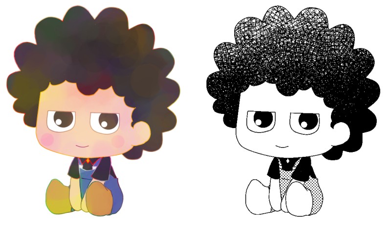 トーンの貼り方とかわからないしホウジくんの髪だけベタ塗っとけばいいでしょって思ってたけどカラーをトーンに変換?する方法学んだのでこれならできるかなぁ? しかし単語の意味調べるとこから始めるからあらゆることに時間がかかり過ぎる💦