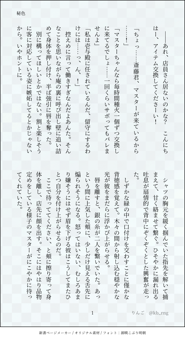 りんご☆quiet followDONE秘色斎山 / 恋仲 / 店番南さんの話 ##カルデア斎山 show all(+3 images) Tap to full screen (size:618x1132).Repost is prohibited Let's send reactions! freqpopularsnackothersPayment processing Replies from the creator Follow creator you care about!☆quiet follow りんごTRAINING色々小ネタ練習3山南さんの実装一周年記念&邪馬台国から三周年記念などなど、小ネタまとめです今回は全部カルデアのお話です 23 りんごTRAINING色々小ネタ練習2カルデア斎山・アンドロイドなみさんパロ等トンチキばっかり!別アカ2022年10月〜2023年9月ログ 21 りんごDONE交際斎山 / ほやほや恋仲 / どうしよう、と思っているふたりの話 4 りんごDONE墨色と嫉妬斎山 / 恋仲 / ⚠️山南先生バレンタインネタバレ 3 りんごDONEこむぎ色と不純斎山 / 恋仲 / 悪趣味な1⃣ちゃんとまだ初心だけど色々されてしまっている先生 3 りんごTRAINING色々小ネタ練習カルデア斎山・メイドパロ斎山片想い両片想い擦れ違い湿っぽくてラブラブなごちゃ混ぜ別アカ7月〜9月ログ 24 recommended works horoyoi_1127PROGRESS灯有r18漫画 とっても描き途中。ページは繋がってない18↑? 3 angccokeDOODLE마얔 낙서파우아키 미스아키 함유 4 laoluziDOODLEgktu 半人半狐x教主刀堕了有点ooc对不起 ノダヌキDONE医者×ダンサーな留文のプロローグと第1話。ちょこっと修正して公開します(作業進捗で公開してた分は非公開済)。シリーズものとして書き上げたら本にしたい所存。pixivには、後日投稿します。Pass→18↑ですか? y/n 7902 たわにさんDOODLEいこみず(ワンドロ「肩」で描いたものです。)噛み癖があるイコさん大好き!!!パスワード:18歳より歳上ですか?(y/n) とらはらDONEちょぎにゃんWEBオンリースペース用の絵でした。ありがとうございました!展示マンガに祝装ネタはなかったんですけどお祝いなのでね…!2枚目はやっぱ目描きたいな~で没にしたものです。が、鼻チュー絵はなんぼあってもいいですからねの精神でUPします 2 ひまわりねこDOODLEメモ用紙に書いたジュリちゃん!自分の使用カラーに塗ってみたやつ。#スト6 Qe_trpgSPOILER「その真紅に愛を見る」現未×チョコをいただいて、しみじみ。 ゆもやまDOODLEとある種の鳥は採食の際、白色個体は自ら働きかける場合が多く、黒色個体は待ち伏せが多いというとても良い話を聞きました