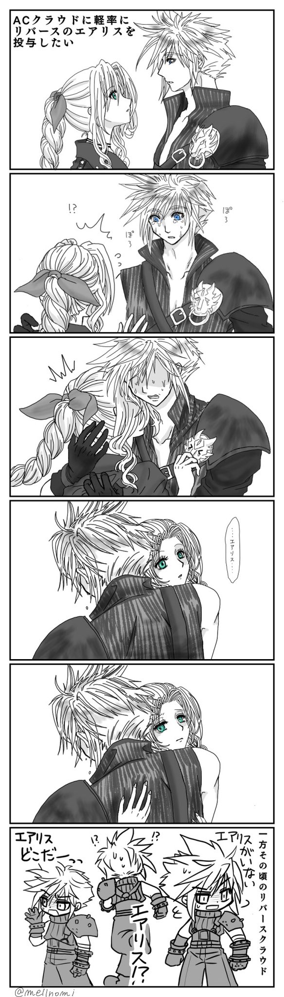 2コマ目のクラウドはクラウドお好きな方に「クラウドはこうはならんやろ」って解釈違いを起こさせてしまうかもしれないですが、リバースの忘らるる都の一連の流れ見てると、この子エアリス絡みならボロボロ泣いちゃうだろうし泣き顔見られた後はスンッて「泣いてませんけど????」と超絶ヘタクソな誤魔化しかけてくると思ったのでここは一つそんな感じでお願いします
