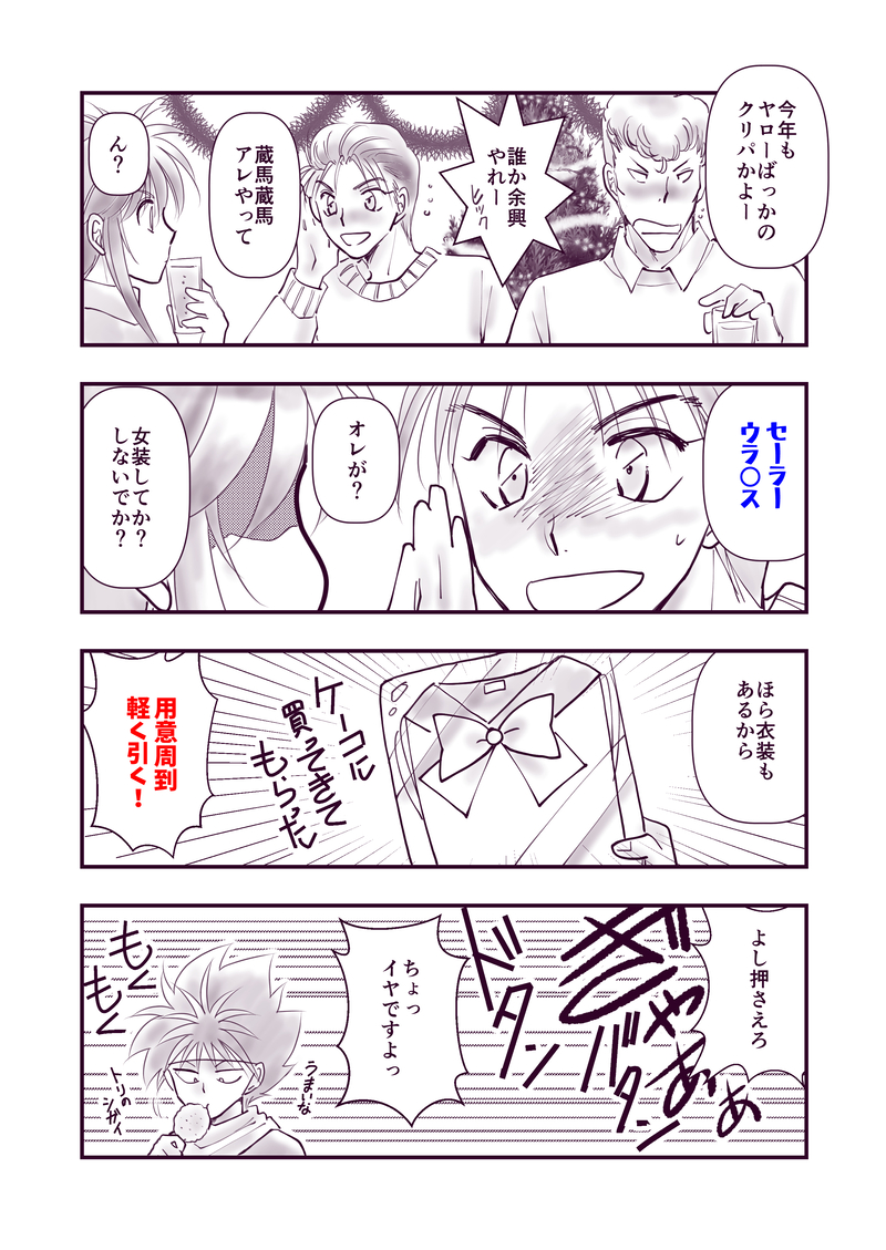 お題「クリパで幽白メンツから女装強要され、我関せずな飛影に八つ当たりする蔵馬(要約)」