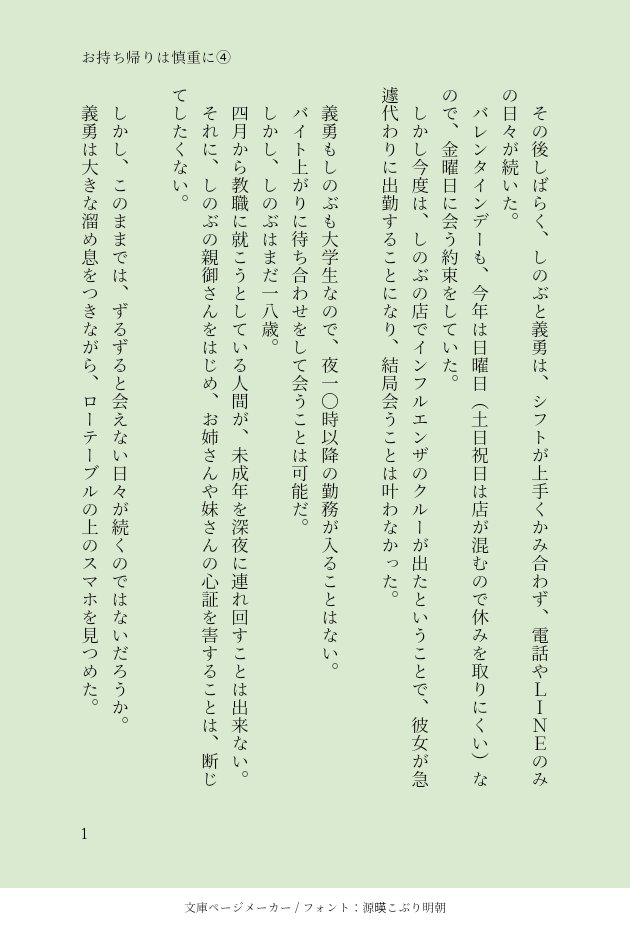 satsuki470517☆quiet followDONE「お持ち帰りは慎重に④終」文庫メーカー全24ページ※マクドナルドコラボぎゆしの小説※現パロぎゆしの※義勇さん体育大学4年生※しのぶさん薬学部1年生※錆兎、真菰、カナエ、カナヲも出ます※全員前世の記憶あり #ぎゆしの Giyushino #現パロ parodyingTheReality show all(+23 images) Tap to full screen (size:630x928).Repost is prohibited Let's send reactions! freqpopularsnackothersPayment processing Replies from the creator Follow creator you care about!☆quiet follow satsuki470517DONE「朱の髪紐と赤蜻蛉(あかとんぼ)」新書メーカー全11ページ※CP要素ありません※義勇さんが主人公※しのぶさん、アオイ、すみ、なほ、きよが登場します※大正時代は「元結(もっとい)」という、水引のような紙製の髪紐を使っていたと思われますが、文中の義勇さんは組紐で髪を結っています※過去にツイ上げした作品をこちらにも再掲しました 11 satsuki470517DONE「百年越しの色待宵草(いろまつよいくさ)」新書メーカー全13ページ※現代軸※ぎいしの※ほんのりさびまこ要素あります※過去にツイ上げした作品をこちらにも再掲しました 13 satsuki470517DONE「編笠百合(あみがさゆり)に手を伸ばし」新書メーカー全7ページ※大正軸※ぎゆ→→→(←)しの※超微糖です※編笠百合の鱗茎(りんけい、球根)には風邪や肺炎の症状を鎮める効果がある※過去にツイ上げした作品をこちらにも再掲しました 7 satsuki470517DONE🌊🦋webオンリー既作①「昼から月に願掛けを」(文庫メーカー全16P)しのぶさん生存if第1作目最終決戦後のしのぶさんの心境に焦点を当てたお話です(~決戦10年後まで)※童磨戦を捏造しています※痣の寿命チャラif※「昼から月」とは、真昼の空に浮かぶ白い月のことです※題名は「五月雨の/よも足らぬ夜に/継げとてや/昼から月の/まだき見ゆらん」(躬恒集三○一)より引用しました 16 satsuki470517DONE🌊🦋webオンリー既作品②「花浜匙(はなはまさじ)を抱きしめて」(新書メーカー全16P)しのぶさん生存if第2作目第1子妊娠~出産までのお話です※出産に関する描写があります※花浜匙は第1子の誕生花(4/18)のスターチスの和名です。※花言葉「変わらぬ心」「永久不変」※作中の逆子娩出術は、江戸時代後期の産科医、水原三折(みずはらさんせつ)の探頷術(たんがんじゅつ)を引用しました 16 satsuki470517DONE🌊🦋webオンリー新作「風蝶草(ふうちょうそう)に頬を寄せ」(新書ページ全14P)しのぶさん生存if3作目第2子妊娠~出産までのお話です。※出産に関する描写があります※風蝶草(ふうちょうそう)はクレオメの和名で、第2子の誕生日(8/8)の誕生花です※風蝶草の花言葉「想像したほど悪くない」「風のように舞い、蝶のように刺す」「小さな愛」 14 related works kakikototoriruDONE現代鬼殺隊ラブコメ【それぞれにつらつらと思うこと】緩い閑話。いやそれは君のことですとツッコミたい誤解をする🌊と見た目でだけでモテまくって来た🦋の先入観 2 violetheart08DONENSFW art I commissioned from @kimmy_tsunami for #giyushinoweek2021! This inspired the prompts for my fics for the prompts (Public Sex) and (Foreplay), which I will upload later. PLEASE DO NOT REPOST. 翠茄(suica)PROGRESS炭カナになる予定なのにぎゆしのからスタートしてる kakikototoriruDONE現代鬼殺隊ラブコメ続きのその後お付き合い後は意中の相手に本人の好きなとこ激語りした事や好きになりませんとか本人に言っちゃった事実に身悶えて欲しいー✨ 月映(tukie_choco)DONEふたりはいつまでも3開催おめでとうございます㊗️去年のVDとWD衣装のぎゆしのを描いてなかったので描いてみました。今年のも楽しみですね🥰描いてる時は、伯爵令嬢は〜みたいな絵だなと思ってましたあと、義勇さんはなぜ薔薇だのフリルだの着けても違和感ないんでしょうか?絵柄のせいですね。すみません 2 kichise__REHABILIおこりんぼ義勇ぎゆしの sirugeruDONE sirugeruDOODLEぎゆしののこの構図多いな! 水実水果(みなみみか)DOODLE自分の好きなカプに割と死別が多いのではと氣付いた今宵。別に悲恋がいいとか死別がいいとか思ってなくて、むしろ物語的にも「めでたしめでたし」で終わる方が好きなんですけど。何故だ・・・悲劇に芸術を見出す日本人性か・・・。(ほんとかよ)ていうか「異動」じゃなくて「移動」だな。誤字(憤怒) recommended works nobunaga49DONE園児ジャギ子ちゃんと保育士サウ兄のバレンタイン。 capiBLANKホスト三郎~ ふうかDONE胡蝶しのぶさんです。左下はお気になさらず笑 2 りゆ。DONEこんな表紙の本出したい。内容はまだない kakikototoriruDOODLE元々の性格の「しっかり者女子x天然男子」なぎゆしのも好きです。年齢設定は🦋さん年長パターンで。大正軸とは全然違う性格や関係性を新しく築くのも見たいー。 もちもちクマTRAINING💎さん×🔥さん社会人同僚現パロです。💎さん→→→🔥さん片想いが書きたくて、初めて書いてみましたが…難しいですね。やっぱり💎🔥は、読み専が一番だわ!! 9773 parvus_yuuMEMO現パロなれそめ、とりあえずこれで完了!全然まとまらなくて、3ヶ月もかかった…webオンリーでウォロシマ成分を