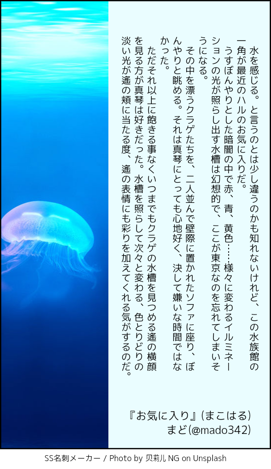 SS名刺メーカーに収まらない長さのお話はpixivに置いています。そちらもご覧頂けたら嬉しいです(*´ ` *)💓