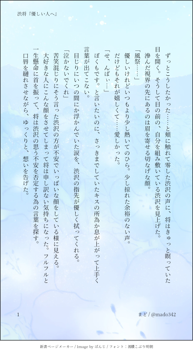 SS名刺メーカーに収まらない長さのお話はpixivに置いています。そちらもご覧頂けたら嬉しいです(*´ ` *)💓