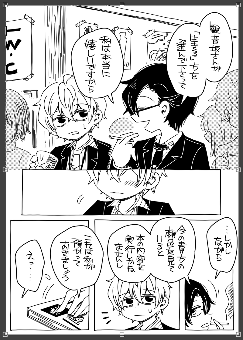 m_makise☆quiet followPROGRESS進捗7p目とりあえず公開はここまでで完成したらまたツイッターに投稿します!残り5pくらいあるからまだまだかかるぞ… Tap to full screen (size:1003x1405).Repost is prohibited m_makisePROGRESS用事片手間にやってて完成させられなかった、セールが終わってしまうやん……!!! m_makisePROGRESS下描きまでしかできなかったエンジェルウィスパーのファンアート、まだ序盤も序盤なので本編の変更点が楽しみで仕方ない!!こういう構図を取ると、どうしても古のペーパーみたいになる、古のオタクなので。。。(下描きなので名前とか超適当に描いてしまってた、ごめんなさい、間違ってる) m_makisePROGRESSめ~~~~~っちゃ久し振りにお絵描きしました、いつも「もしかして、もう描き方忘れてるのでは…」とビクビクしてしまいます、全然忘れるとかないんだけどね、長年乗ってないチャリにいきなりでも乗れるみたいなね。続きはまた今度! m_makisePROGRESS今日中に終わらせたいんだけどキツくなってきた~~!背景の処理が特にヘタクソで、レイヤー数がとんでもない事になる……線画も1キャラ毎に全部パーツ分けしてるくらいレイヤーだらけだよ。 m_makisePROGRESS6/8p目寝るまでに後1p終わらせて明日仕上げと洒落込みたいぜ…! m_makisePROGRESS5/8p目縛り実況を観ながらポツポツ作業を続ける……昔のニコ動のノリが大好きなので古い動画見るの楽しい! recommended works 4444ykMOURNINGお蔵入りライ勝(2016年) 5 Hato_TakaseDONEれいみちゃん(@reimisosaku1)宅のハナちゃんとメシマズの犯人ちゃん描かせて頂きました〜!誕生日絵なのでケーキ!🎂2人を描くのもハナちゃんの味感想考えるの楽しかったです😊改めておめでとうございます! 2 青りんごサワー🍏DOODLEエモ義士祭の落書き2024。今年はより趣味に走るぞ〜!と意気込んだらじゅきせんせから軍服くらんパをお出しされて横転 kamijo_gDONE自身のクリスマスのアイコン用にトナカイ尾何考えてるの?どういう感情?という表情してる尾が好きです ひづ。DOODLEネップリイラスト 6 炭烧鸽子苑DOODLE开黄腔的弟弟不是好弟弟,罚你不许中出(喂) まよ🍊DOODLEそんなえっちでもない匂わせ(?)ppmy HeartheirwingsDOODLEsummary: 御影玲王在圣诞节离家出走。已经订婚的二人 温暖又有些波折的日常ooc归我bgm: This Is Living(Hillsong Young & Free) 8582 kawausoman12DOODLECoC『ルックアフターはあたたかで』