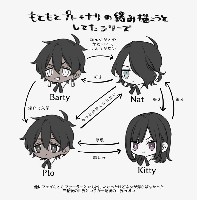pompomnium☆quiet followDOODLE学パロにおける相関図 #バーナサ vernasa Tap to full screen (size:760x768).Repost is prohibited Let's send reactions! freqpopularsnackothersPayment processing Replies from the creator Follow creator you care about!☆quiet follow pompomniumDOODLEGEでナサニエルが約束守ったことによってバが独断でナを守り逃亡を決めてルート分岐するバナサ(と解釈しました)のお題ありがとうございました!オチに難航しすぎて長らく寝かせてしまいました尺が許すなら色んなルート描きたかった 7 pompomniumDOODLEぼちぼち原書感想描いたことない大臣付きしかしここら辺のバはナサニエルにずっと文句言っててかわいいやらおいたわしいやら pompomniumDOODLEエジプト組 pompomniumDOODLEあとでアマンダと夫人もいれるかも?二枚目はハゲちゃんバージョンなので好きな髪型足して遊んでください 2 pompomniumDOODLE間が空きつつ原書感想プトは達観した善性を発揮してる瞬間よりもそこそこ年相応な瞬間が好き pompomniumDOODLE大遅刻バナサの日!あとで加筆修正すると思われる 2 related works pompomniumPROGRESSバナサ多分後々に加工しすぎて原型なくなる pompomniumDOODLEバナサのエイプリルフールネタバは嘘しか言わない日だと思ってる(最後のコマいるか?) pompomniumDOODLEナサニエルの女装クソダサそうというらくがき pompomniumMAIKING三次創作好きな海外バナサ小説が元なんですけど読み返しついでに自分用にと日本語で小説体にしていたらあまりにも好きすぎて描いたやつ線画の方がいい pompomniumDOODLEバナサですお題箱よりお題ありがとうございました!!時系列ごちゃつくので明言してないですが一応モブの妖霊は二巻の序盤でナサニエルが召喚した後に即解雇したキャスターくんのイメージでした↓・天使ケルビムの姿(本当は太ってる)・品が良く腕も確か・主人に服装を合わせるほど媚びる姿勢・ただ煽り耐性ゼロだったために揉め事起こして解雇 pompomniumDOODLE挿入シーンを描く練習をしたいのにままならない 2 pompomniumDOODLE怒られたら消すぞのバナサタンブラーでのバナサネタの投稿が好きすぎたので勝手に描き起こしたもの pompomniumDOODLE概念的バナサのエジプト主従バはプトを選ぶけど情でナサの手を取ってほしいという pompomniumDOODLE異世界閉じ込め系のバナサほぼプロットなので話飛び飛びかもしれない肉体関係ありでナが多分40歳手前くらいお題箱でももらっていたのでやがて漫画でも似たようなシチュエーションを描く 10386 recommended works pompomniumDOODLEバナサ2巻ラストハッピーエンドにしてくれ 2 pompomniumDOODLEバーティミアスとアズマイラ pompomniumDOODLEあるあるだと思う pompomniumDOODLE本編シーンの描き起こしこのシリーズ(?)、大体「あのシーン好きだったな、こんなイメージで読んでたな」と先に描き出した後に原作読み返して台詞入れていくので、台詞が全然入らないこと多い pompomniumDOODLEバナサでちゅーしてる pompomniumDOODLEバナサ食べられないから人間の飯に対する良し悪しが雑なバ pompomniumPROGRESSバナサガーゴイルの落とし所は未だにわからん pompomniumDOODLEバ♀ナサにょたのバのネタ、どうしても2巻ナサニエルを合わせたくなる pompomniumDONE蛇姦本が出ればこんな表紙・裏表紙になる予定