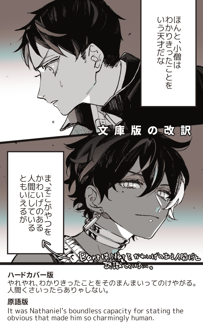 pompomnium☆quiet followDOODLE文庫本の改訳によってバがナをかわいげのある人間だと認識していることがわかった回 Tap to full screen (size:667x1090).Repost is prohibited Let's send reactions! freqpopularsnackothersPayment processing Replies from the creator Follow creator you care about!☆quiet follow pompomniumDOODLE五回目と六回目を合併させたので二回分の振り返りバナサ厨的にはPGは読むの辛いシーン多すぎるよ~~~~ pompomniumDOODLEGEでナサニエルが約束守ったことによってバが独断でナを守り逃亡を決めてルート分岐するバナサ(と解釈しました)のお題ありがとうございました!オチに難航しすぎて長らく寝かせてしまいました尺が許すなら色んなルート描きたかった 7 pompomniumDOODLEぼちぼち原書感想描いたことない大臣付きしかしここら辺のバはナサニエルにずっと文句言っててかわいいやらおいたわしいやら pompomniumDOODLEエジプト組 pompomniumDOODLEあとでアマンダと夫人もいれるかも?二枚目はハゲちゃんバージョンなので好きな髪型足して遊んでください 2 pompomniumDOODLE間が空きつつ原書感想プトは達観した善性を発揮してる瞬間よりもそこそこ年相応な瞬間が好き