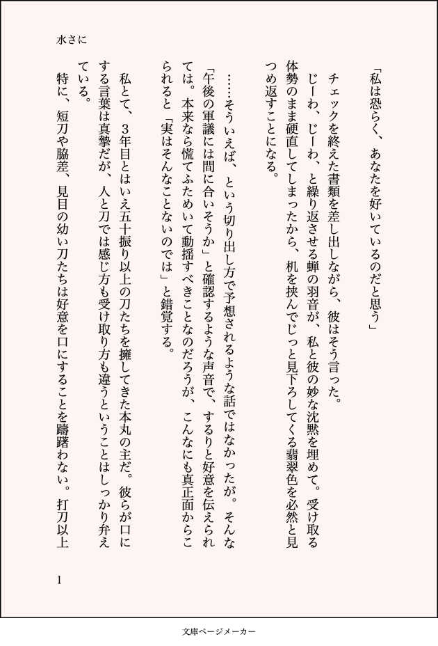 banketu_nari☆quiet followDONE水さに(修正前) #水さに show all(+5 images) Tap to full screen (size:630x928).Repost is prohibited Let's send reactions! freqpopularsnackothersPayment processing Replies from the creator Follow creator you care about!☆quiet follow banketu_nariDONEセイバー水心子正秀 7 banketu_nariDONE水さに(修正前) 6 banketu_nariDONE7年目の審神者、水心子くんの視点加筆部分戦闘シーンが欲しかったので 4 related works sumodattayo313DOODLE水さに さに水 女審神者顔あるどしもねた。※3/18 一枚追加したため成人向けにします。 2 sumodattayo313DOODLE水さに。女審神者顔有り。描きたいところだけ何番煎じネタ。56。ぬるいけど一応成人向け。 AKIDOODLE水さに(⚠︎女審神者顔あり)疲労困憊時の主吸い AKIDOODLE水さに(⚠︎女審神者いる)政府時代は手入れといえば機械的なものだったのが、本丸に配属になって初めて中傷で帰還してきて、自分のことを心配するさにわと正面から向かい合ったとき、改めて我が主の刀になったんだってことを感じてほしい…たぶん最初は刀にそう気安く触れるものでは〜とか言っちゃうんだけど… sumodattayo313DOODLEらくがき水さにです。ツイーヨしてたやつ。わからせ。弟と言っちゃうさにわちゃん。顔あり女審神者。 sumodattayo313DOODLE水さに、もしくは夢絵。すいしんしくんにすけべめって言われたいだけのらくがき。やや背後注意。 sumodattayo313DOODLE水さに。フォロワッサンの素敵なセリフをお借りしました! AKIDOODLE水さに(⚠︎女審神者いる)がちゅうしてるだけ sumodattayo313DOODLE水さに。女審神者顔あり。多分即落ち2コマちゃん。大したことはしてないけど一応せんしてぶ。みゅネタ、あります。 recommended works sumodattayo313DOODLE『即堕ち2コマ審神者ちゃんは今度こそすいしんしくんをアンアン言わせたい!』※逆転なし、水さにです。 sumodattayo313DOODLE審神者顔でてないけど水さに。ぬるいけど一応せんしてぶ。ごめんねって言いつつやめない系スイシンシクンッ謎シチュ sumodattayo313DOODLE女装攻め描きたくて…ちょっとだけ…水さに。女審神者おる。女装注意。 sumodattayo313DOODLE事後なのでワンクッション。水さに。顔あり女審神者いる。何も考えず雰囲気で読んでください。 sumodattayo313DOODLE水さにらくがき。ボロンッ。女審神者顔あり。描きたいところだけ。 むらきち黎人PAST230204凪玲ワンドロ、お題【花言葉】花は一応アングレカムのつもりで描きました sumodattayo313DOODLEさに♀水さに♀ と言うかさに♀水寄りと言うか。あほえrです。女審神者顔あります。格好いいすいしんしくんはいない。 sumodattayo313DOODLE水さに。描きたいところだけ。審神者の脚だけ見える。 sumodattayo313DOODLE※女装 ビキニ👙の日、遅刻!!格好いいすいしんしくんはいない!!!1枚追加した。水さにだった。 2