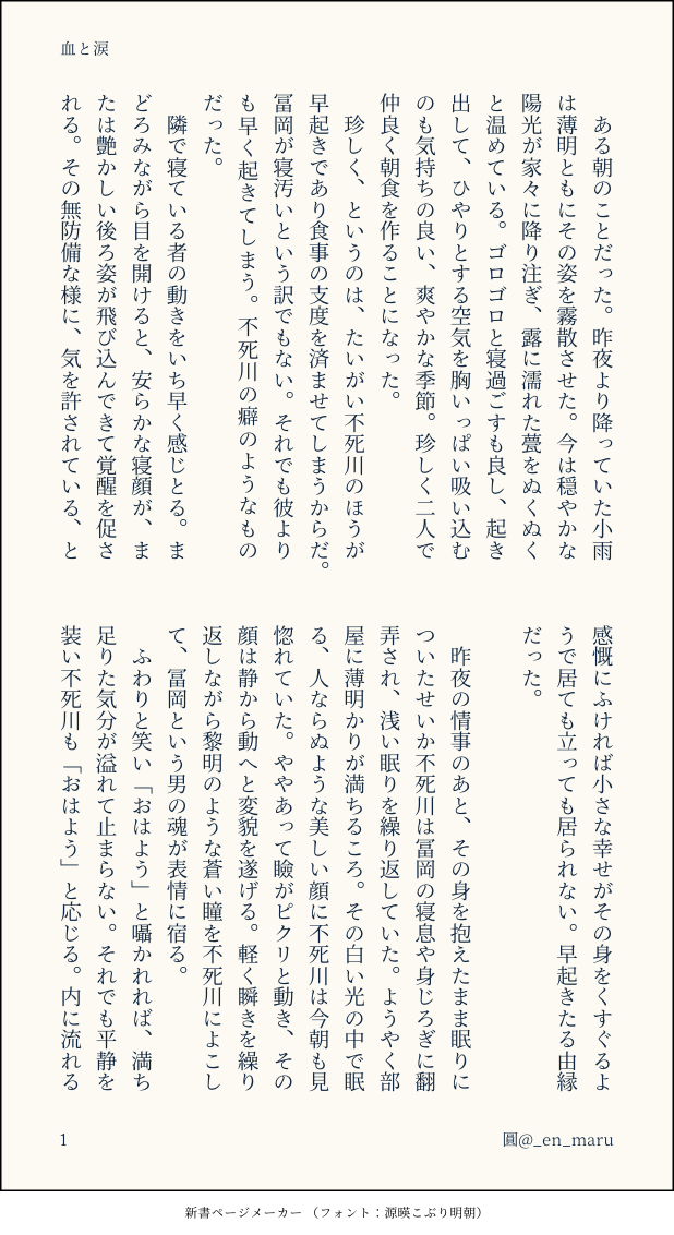 圓_en_maru☆quiet followDONEさねぎゆ 余生 ぬるく血の表現あります show all(+4 images) Tap to full screen (size:618x1132).Repost is prohibited Let's send reactions! freqpopularsnackothersPayment processing Replies from the creator Follow creator you care about!☆quiet follow 圓_en_maruMOURNINGさねぎゆ版ワンドロワンライアカウント様のお題「最後の」で書いたものです。余生 がっつり死ネタです。 7 圓_en_maruDONE🍃🌊余生 全六枚少しいちゃついてます 6 圓_en_maruDONEさねぎゆ 余生 ぬるく血の表現あります 5 recommended works ウラガミDOODLEおやぷんが書いた物語に、挿絵漫画描きました。 2 ASIApixivTRAINING昨日の自主練の手直し版。『縁取る』という表現を相互さんからいただいて広がりました!読んで感想いただけると嬉しいです😊 865 gomachiMOURNINGボツ供養 ワンドロ用に描いてたけど筆がのらなかった… tomko_106MEMO付き合ってそこそこ長いさねぎゆ。キメ学軸のはず。この後はえろになる未来しか見えない。こういう勘違い?すれ違い?ネタ大好きすぎて最早くるしい… 1089 kame2kmtDONE #さねぎゆ版ワンドロワンライ「旅行」「かばん」お借りしました。3枚目が🔞温泉旅行といえばこれ…?!あなたは18歳以上かつ高卒以上ですね?(yes/no) 6 kame2kmtDONE #さねぎゆ版ワンドロワンライお題「オノマトペ」引退後、お酒を飲んだ2人が😘してる(だけ)のお話です。古めの小ネタあり。😘だけですが一応背後注意。 3 Sunrise.DOODLE还是不会画啊…… 3 f0u_XMEMO銀鐧ss引き続き夫婦ごっこしながら任務をこなしている銀鐧です 10845 chaniuyDOODLEクリスマスプレゼントはぼくだよって何番煎じなのさ 2