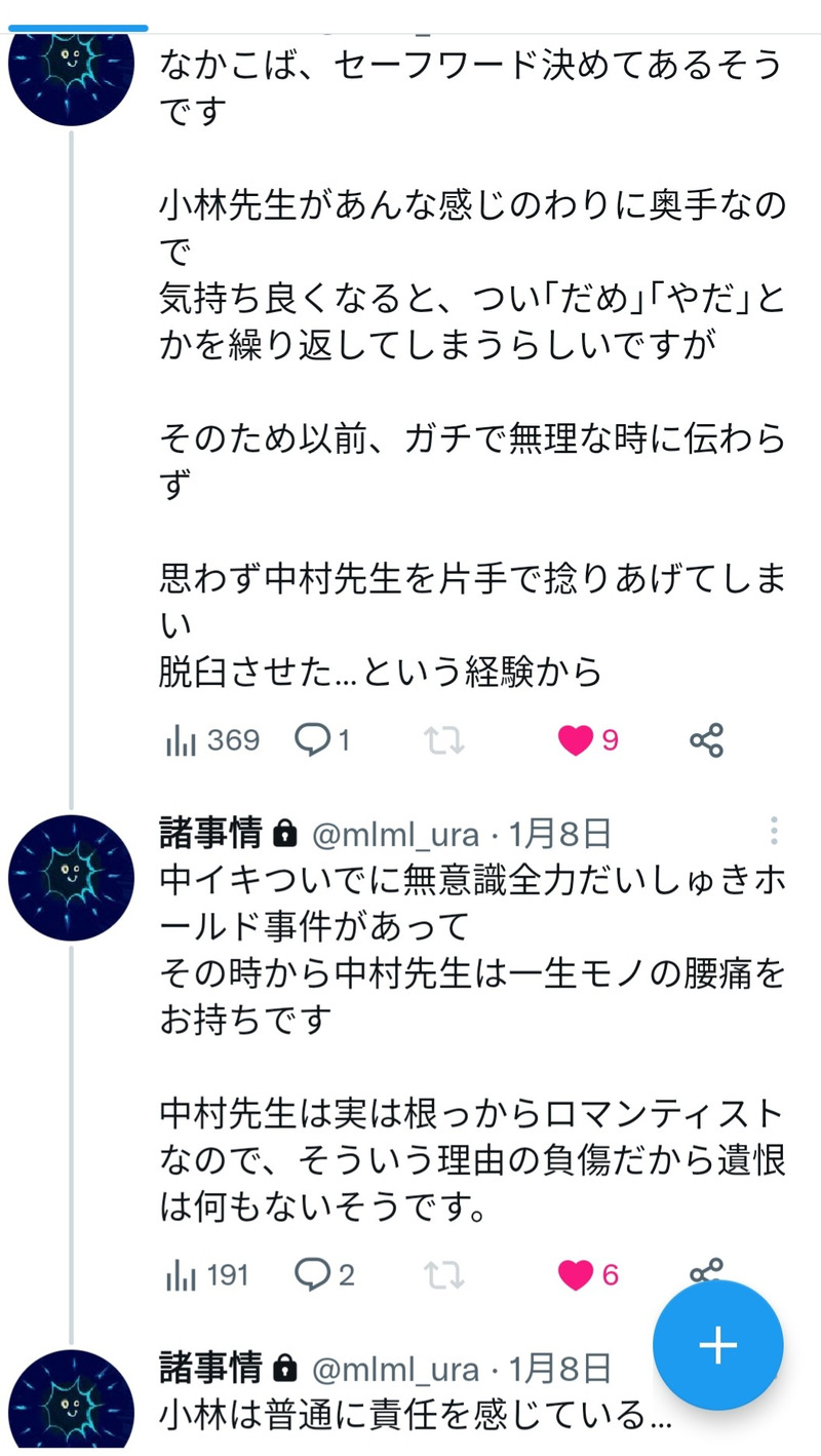 とぅとぉ☆quiet followSPUR MEなりもり山動物園の人気者🦍慶二(ケイこ)くんと飼育員中村さん以前諸事情さん@mlml_ura が呟いていらっしゃったのを描かせて~🙏とお願いして描いてみたんですが…あれ?全然違っちゃった😂ドコヲマチガエタ?小林先生は🦍です。人間に見えるのは目の錯覚です。何でもOKな方へ🙏 show all(+6 images) Tap to full screen (size:1055x1871).Repost is prohibited Let's send reactions! freqpopularsnackothersPayment processing Replies from the creator Follow creator you care about!☆quiet follow とぅとぉMOURNINGなかこばアンソロやっと仕上げました。遅れてすみません😭没シーン供養させてください🙏ここまで仕上げてほぼ描き直し…ごめんなさい。本番前のR18です。成人の方ですね?(3文字) 4 とぅとぉSPUR MEなりもり山動物園の人気者🦍慶二(ケイこ)くんと飼育員中村さん以前諸事情さん@mlml_ura が呟いていらっしゃったのを描かせて~🙏とお願いして描いてみたんですが…あれ?全然違っちゃった😂ドコヲマチガエタ?小林先生は🦍です。人間に見えるのは目の錯覚です。何でもOKな方へ🙏 7 とぅとぉDeep Desireもう1億回使い古されたネタですが、それでもやっちゃう👕バニーちゃん🐰12年前、👕がまだグラフィックデザイナーと付き合ってた頃。今よりちょっと可愛い。筋肉もそんなについてない。彼から頼まれてバニーちゃんの写真を撮ってます🔞ってほどじゃないです。当然成人よね?(3文字)👕が大学の頃フォトショの使えるグラフィックデザイナーと付き合ってたという、広瀬さんの発想お借りしました🙏 とぅとぉCAN’T MAKE先日の紅事変で紹介した赤江漠の「雪花葬刺し」からの妄想絵。キョウジさん編⚠️元4×若キョウ元ネタは主人公(女性)が天才彫師に彫って貰うお話ですがその方法とは?ゆしまさんがこの小説に出てくる主人公を若キョウジで…と呟かれていたのに感銘を受け、私なりの妄想を描いてみましたが…描けねぇ~😅2枚目はこねくり回しに回したけどどうにもならなかったものです。供養に🙏成人の方ですか?(3文字) 2 とぅとぉDOODLE「🐹先生ごはん食べて!」ラクガキ(作品)!深夜の第2部後半戦。R18の部!「何描く?」の問いにまさか叔父貴さんから「R18」という言葉が飛び出ようとは💦この時残っていたのは諸々壁鵜オレンジおそのハラダchittan 叔父貴とぅとぉ(敬称略)さて誰がどれを描いたでしょう?見てもいいのは成人式済まされた方。これ見ても🐹と👕のこと嫌いになりませんか?(3文字) とぅとぉDONEこばやし先生お誕生日おめでとうございます🎉いや、8月号の表紙にはビックリしたわ💦公式に気を遣って全年齢イラストを上げた私の純情を返してください!ああっ!もう日付が変わってしまった!👕、楽しい1日をありがとう!…てなわけで8月号表紙パロ。どこまでも想像の上をいくエロばやし先生が憎い😅 recommended works カフェラテDONEこばやま!「誰にもあげない」弟くんは猛アタックしてるけどまともにとりあってもらえなくて…兄(→→→)←←弟 4 カフェラテMAIKING弟くんの猛プッシュに根負けした兄…のこばやま!の初夜!「めくるめくよる」※弟くんに名前つけてます、便宜上 7 カフェラテSPOILERきえたはつこいのバレー部顧問の数学教師にプレゼント渡す他校マネ(過去何度か告白して断られてる)をこばやまで!小林先生は一応教師なので断っています 2 nishikoDONE🐹👕オールバックメガネ🚬オールバックグラサン🚬 2 とぅとぉMOURNINGなかこばアンソロやっと仕上げました。遅れてすみません😭没シーン供養させてください🙏ここまで仕上げてほぼ描き直し…ごめんなさい。本番前のR18です。成人の方ですね?(3文字) 4 tototokowakaDONEエロくはないですが以前、なかむら先生より実はこばやし先生のほうが着付けうまかったらいいなって呟いたのと、あと単純に2人で温泉旅行してくれ…っていうつおいお気持ちのあらわれです 5 tototokowakaDONEなかこばふぃやんが怖くて落ち着かなくて、なにも考えたくない…と思って描いたまんが少しいちゃついてます時間がなくてなんか画面が白い 3 satosato0356DONEこばやま。🧦が可哀想。(🔑:弟の偽名を半角英字6文字) 3 satosato0356TRAININGこばやま付き合ってる2人初夜の次の日(🔑:弟の偽名ローマ字半角6文字) 2